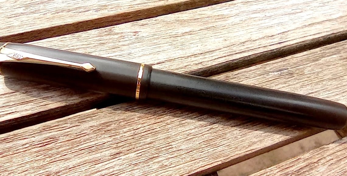 Une large bague dorée à la base. Bouchon ébonite conique au sommet du capuchon. Petite fêlure à la base du capuchon.