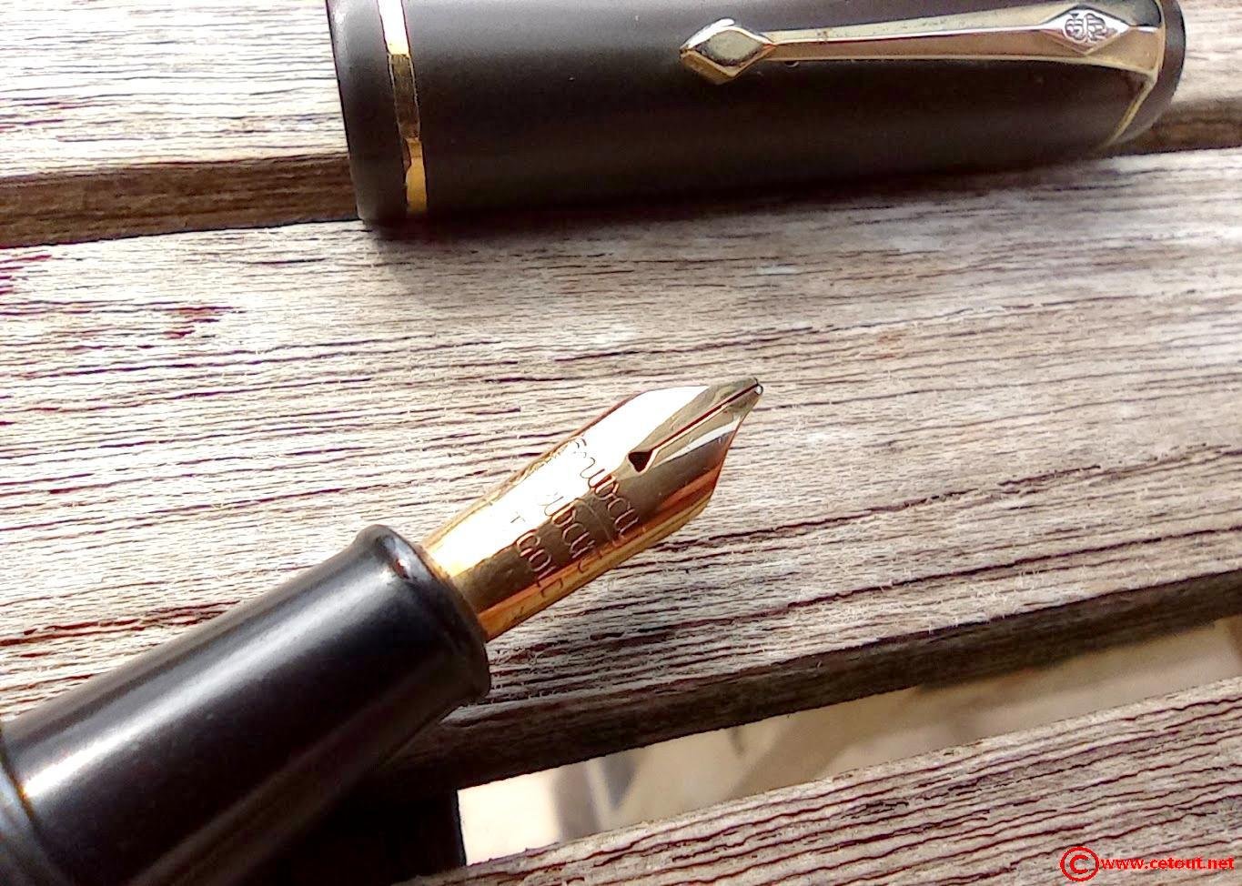 Une large bague dorée à la base. Bouchon ébonite conique au sommet du capuchon. Petite fêlure à la base du capuchon.