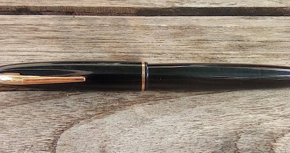 – Capuchon en Celluloïd(?) noire. Clip métal doré avec emboutissage particulier ». 1 bague dorée à la base. Très Bon état global.