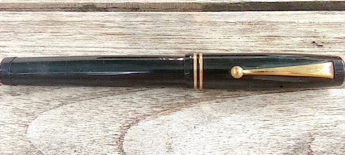 – Capuchon en Ebonite (?) noir. Agrafe métal doré. 2 bagues dorées à la base du capuchon. Très Bon état global.