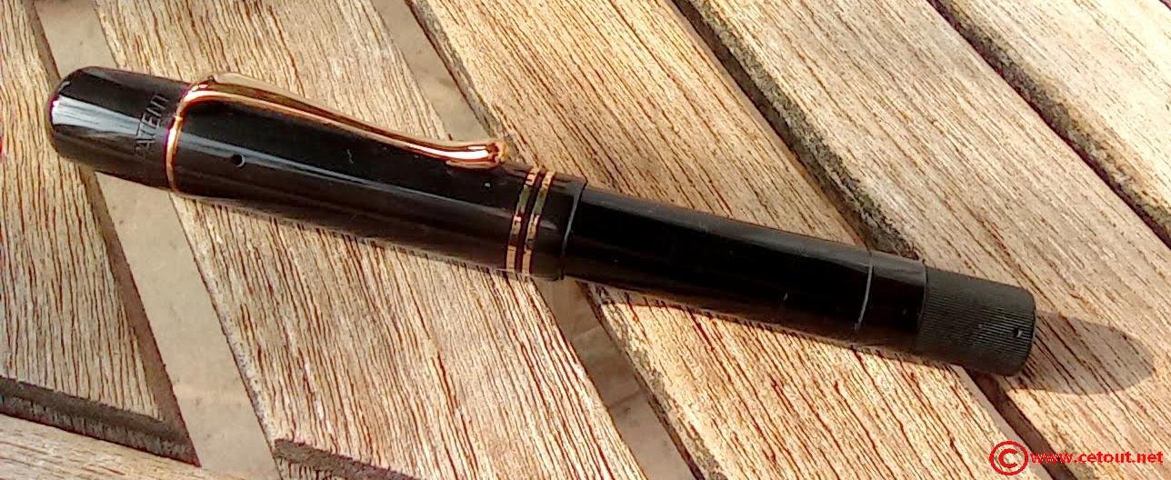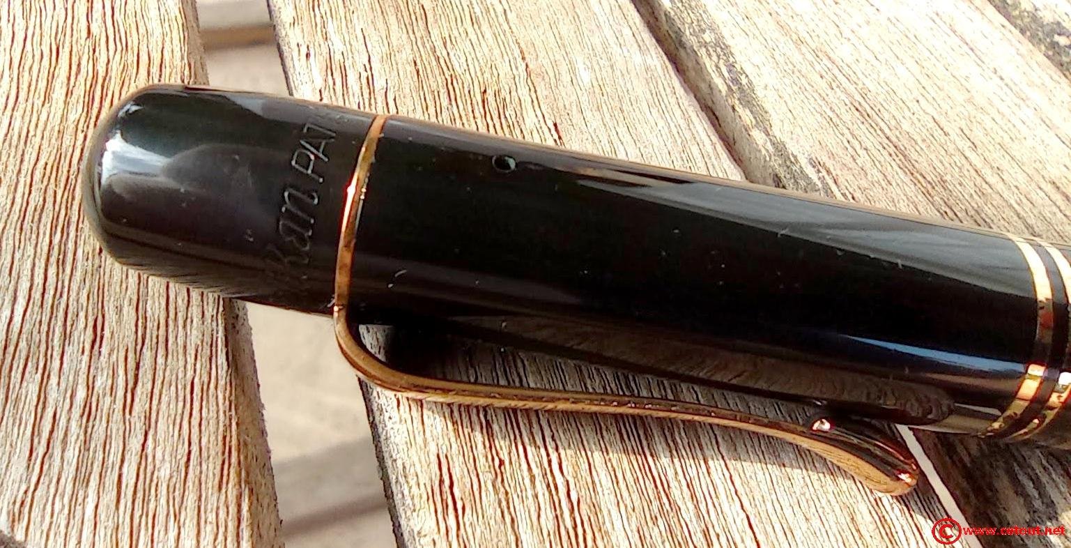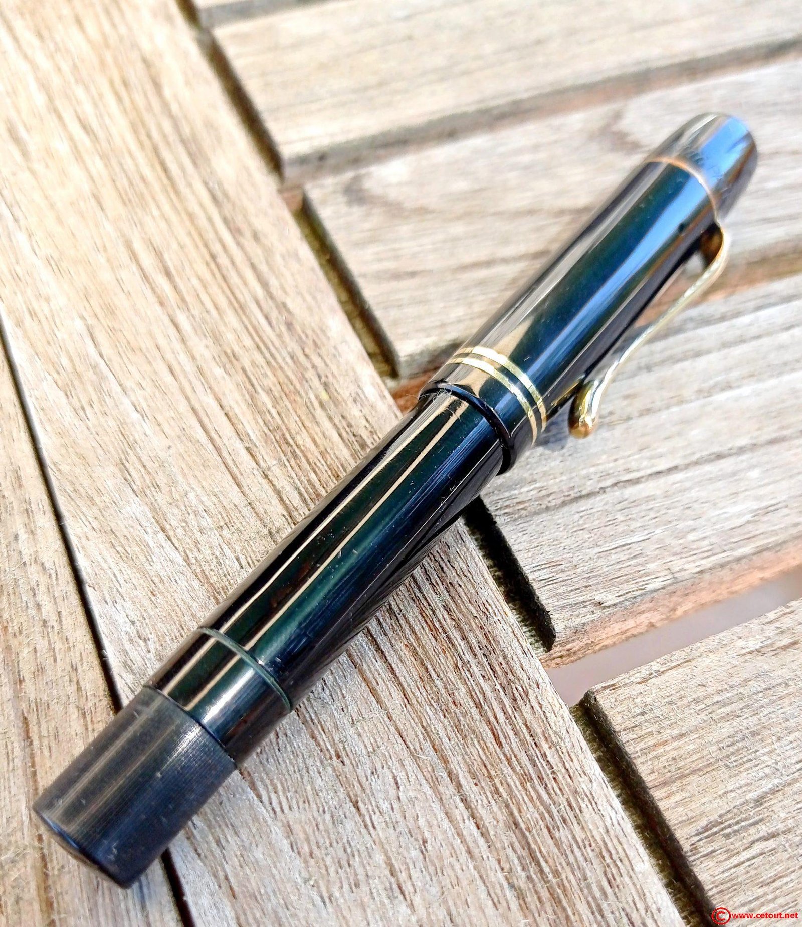 – Capuchon (intact) : Celluloïd noir – Agrafe dorée. Top du capuchon noir en forme de dôme portant l’inscription « Pelikan – PATENT». Insigne PELIKAN sans usure. Base du capuchon avec 2 anneaux dorés.