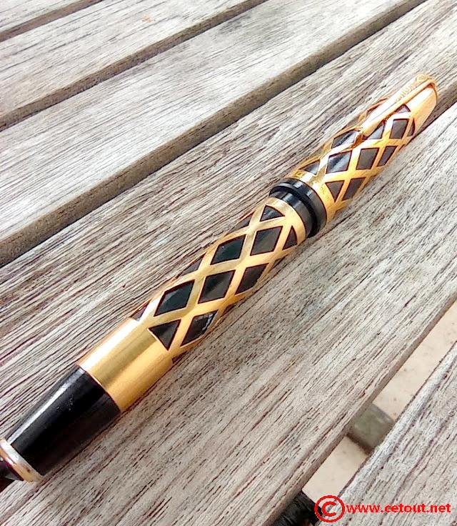 Capuchon noir (celluloid?) avec résille métal doré (filigree). Top en métal brillant.