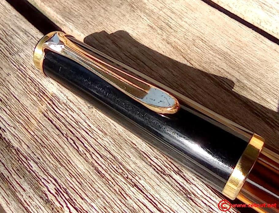 Agrafe dorée distinctif PELIKAN. Top du capuchon plaqué or retenant le clip également doré.