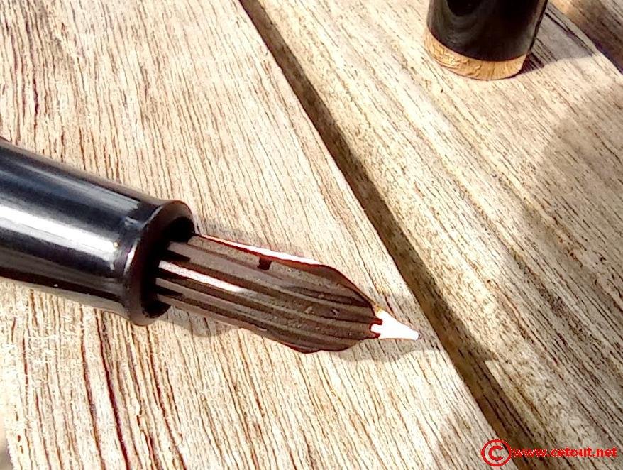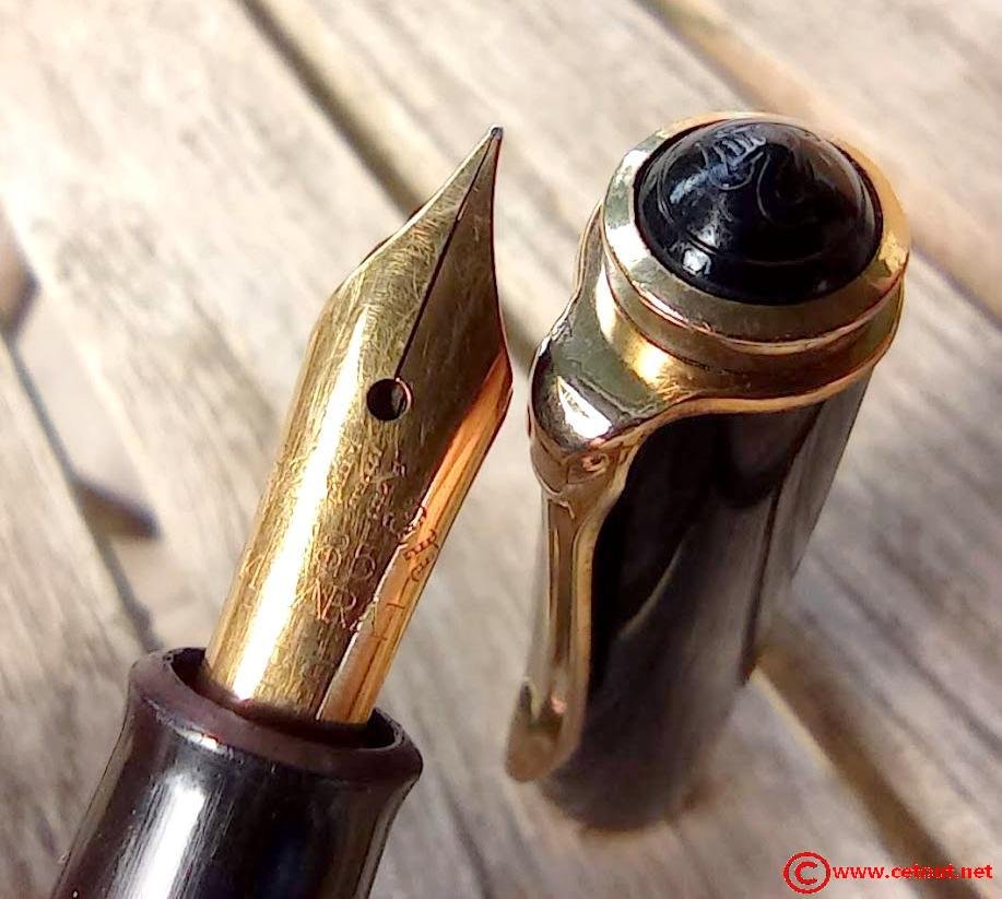 – Bloc plume celluloïd noir : Plume originale gravée « Pelikan » stylisé (écriture réalisée avec des petits carrés) 585 14 KARAT EF.