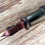 – Bloc plume en celuloid(?) noire. Plume OR. Inscriptions : logo caractèristique des plumes pour BAYARD ( 2 plumes entrecroisées entourées des lettres P et F surmontant « 18 cts » et surmontant à son tour le nombre « 50 ».