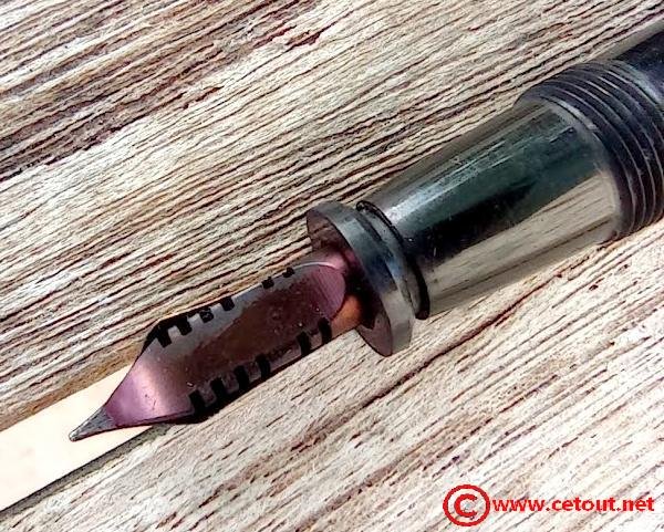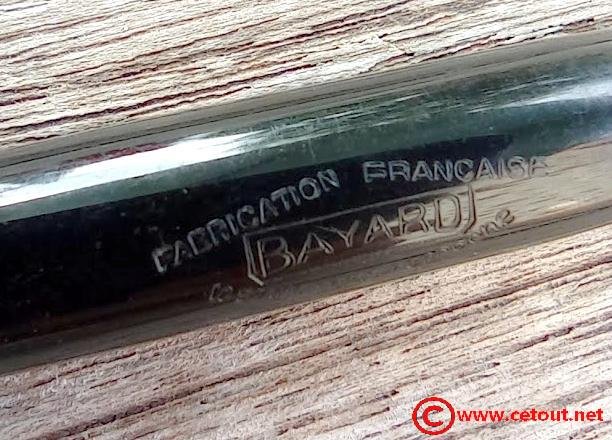 – Corps en celuloid(?) noire. Il est gravé : “FABRICATION FRANCAISE” surmontant BAYARD » stylisé et “Le STYLO SANS REPROCHE”.