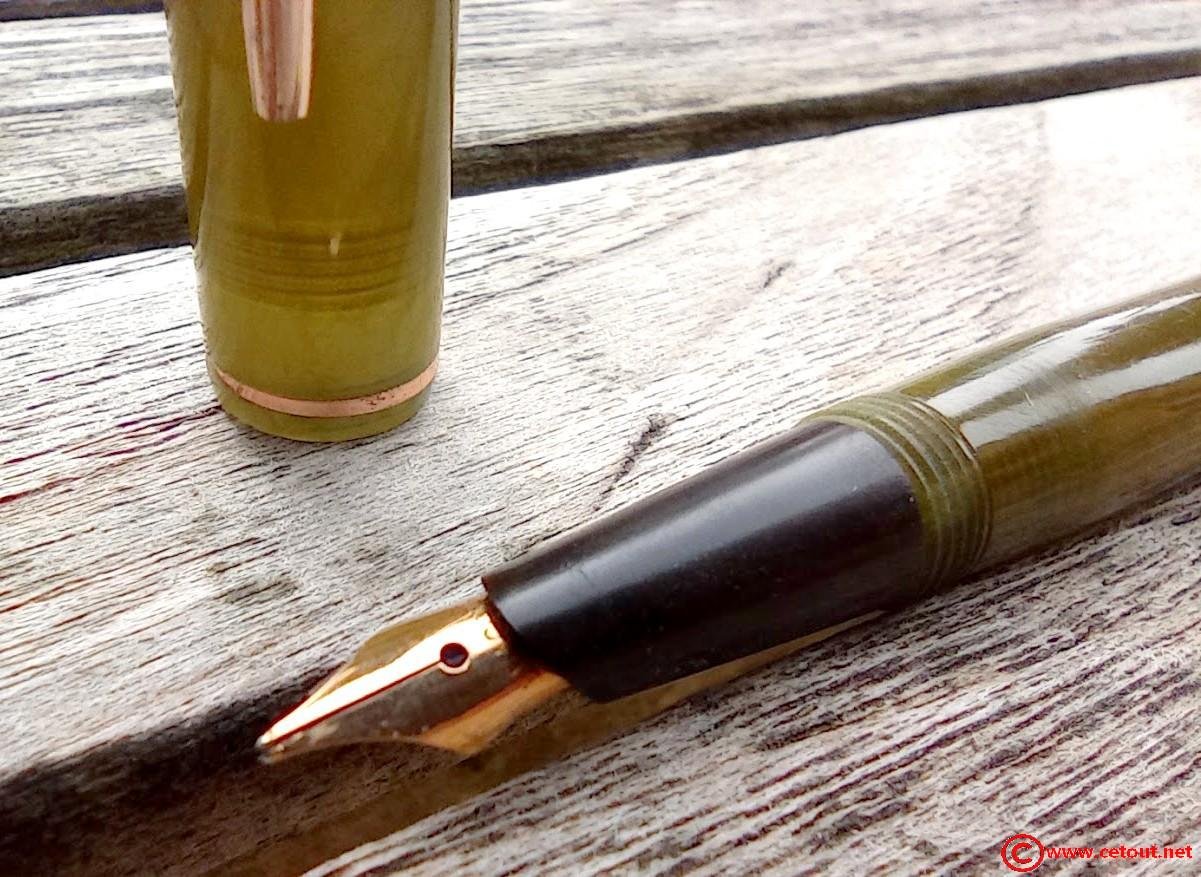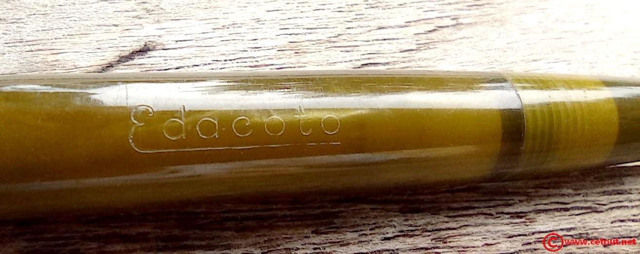 – Bloc plume en ébonite(?) noire. Plume dorée. Inscriptions « EDACOTO», reste caché par un carénage en demi lune.