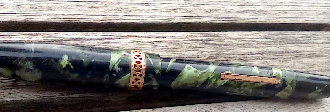 – Capuchon en celluloïd marbrée noir et vert. 1 bague filigree à la base. Pas de Clip métal. Bonnet du capuchon à rectifier. Bon état global.