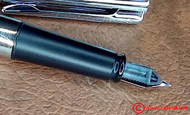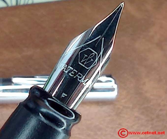 – Bloc plume en plastique noir. Plume métal. Inscriptions : logo Waterman puis WATERMAN suivi de F