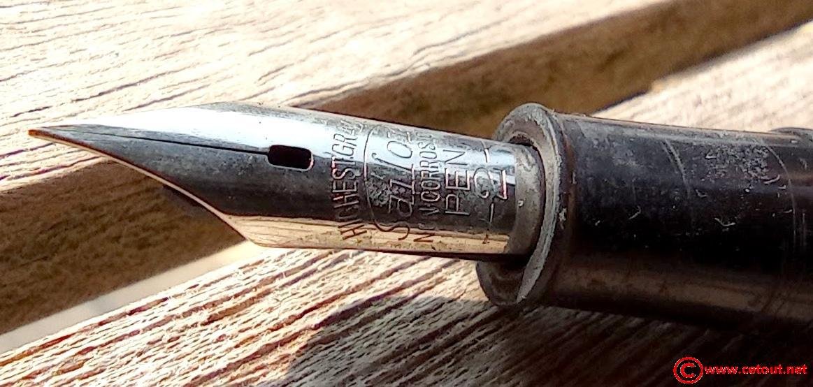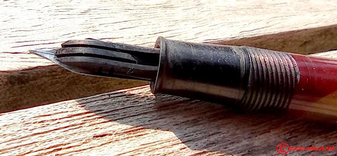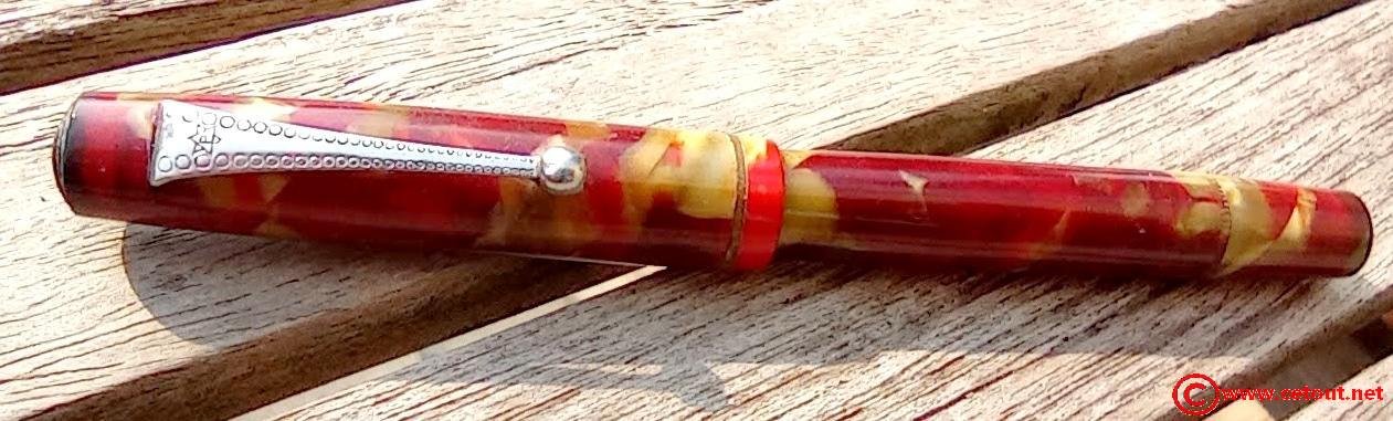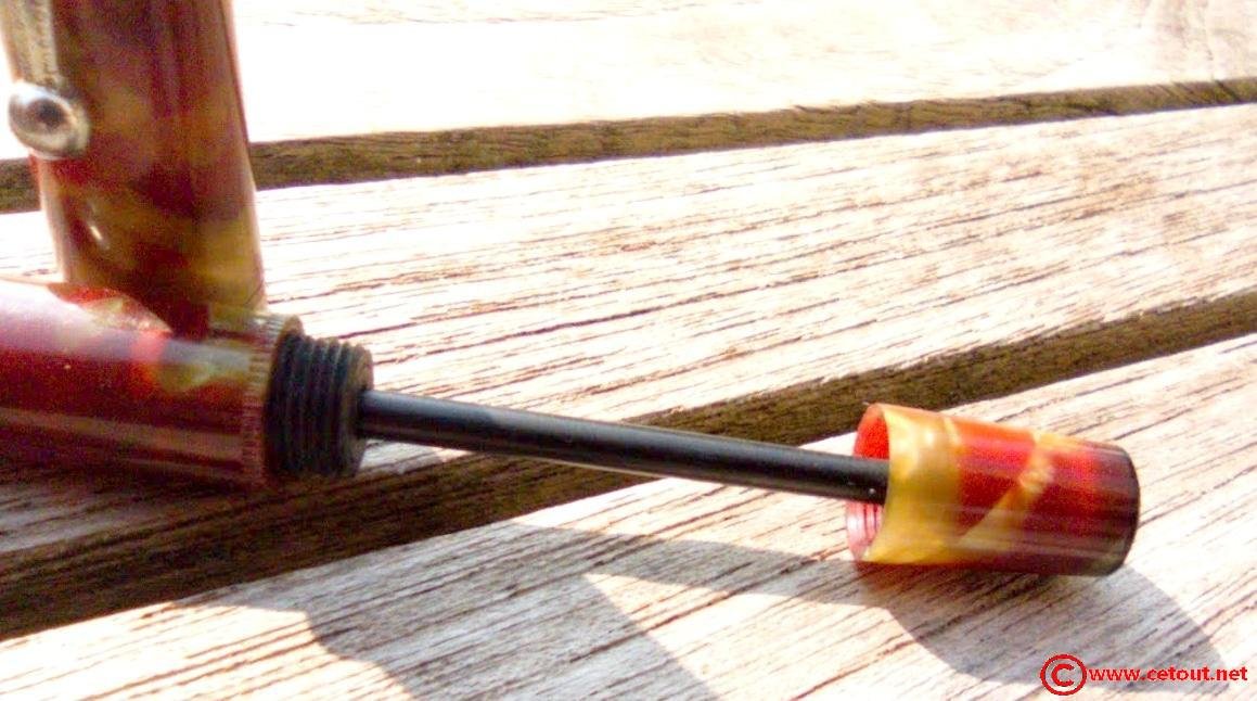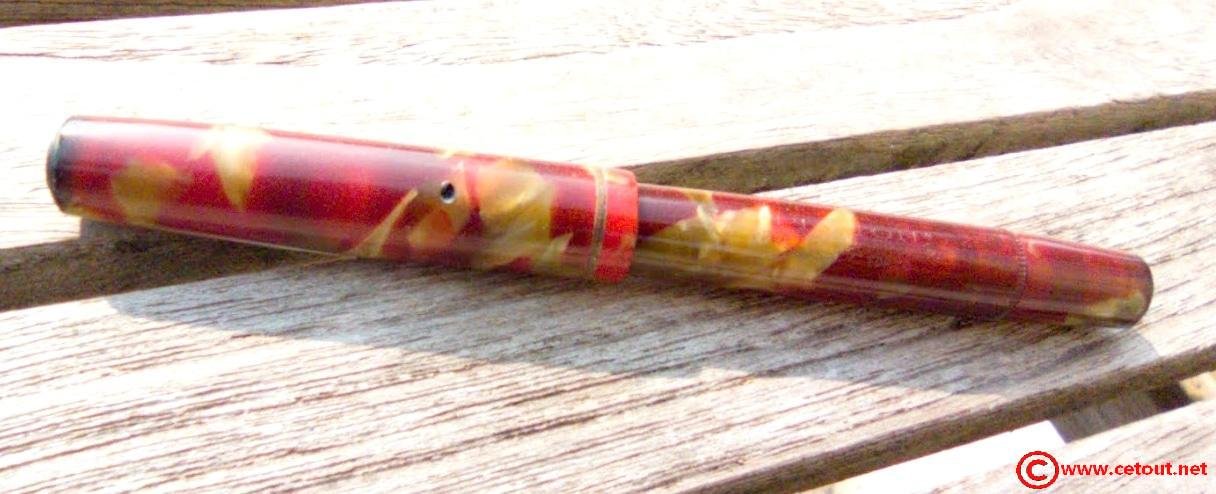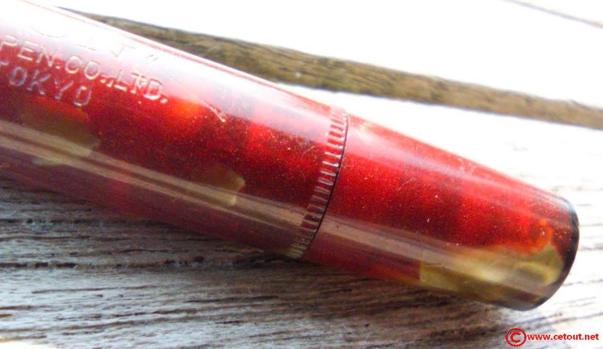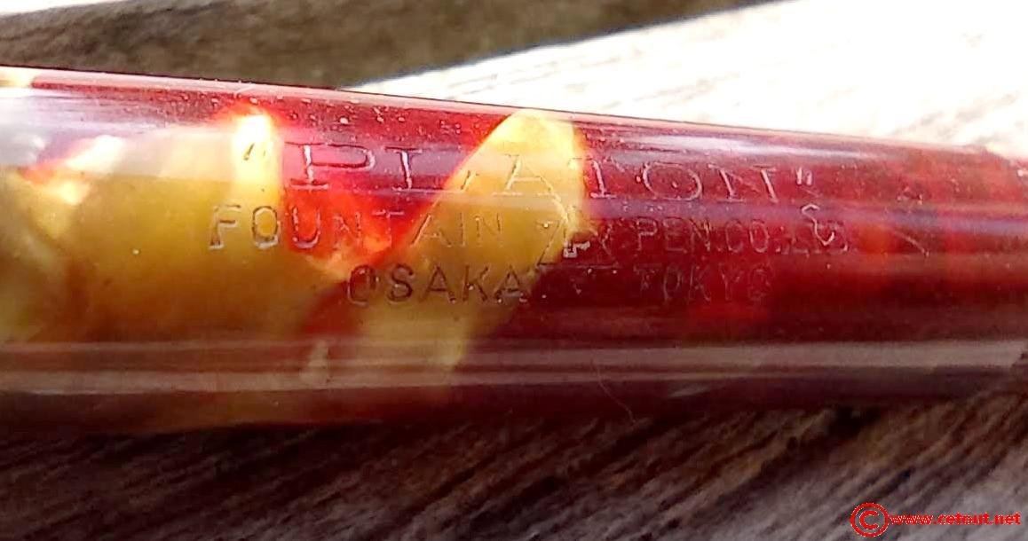 – Corps en Celluloïd marbré rouge avec reflets nacrés. Il est gravé dans la matière : « “PLATON” puis “FONTAINE (logo étoile avec P) PEN. CO., LTD” puis
