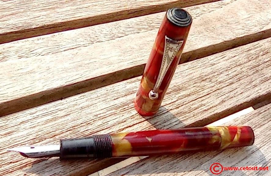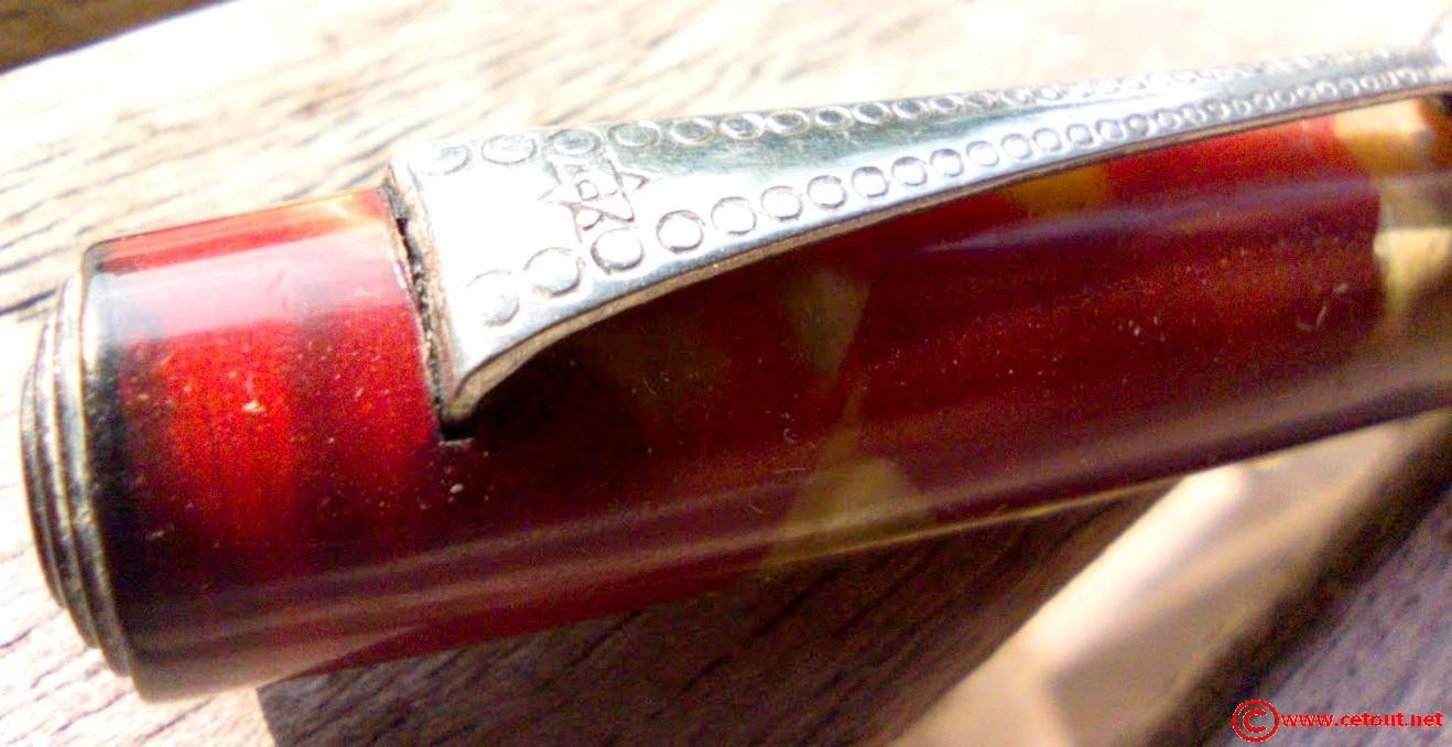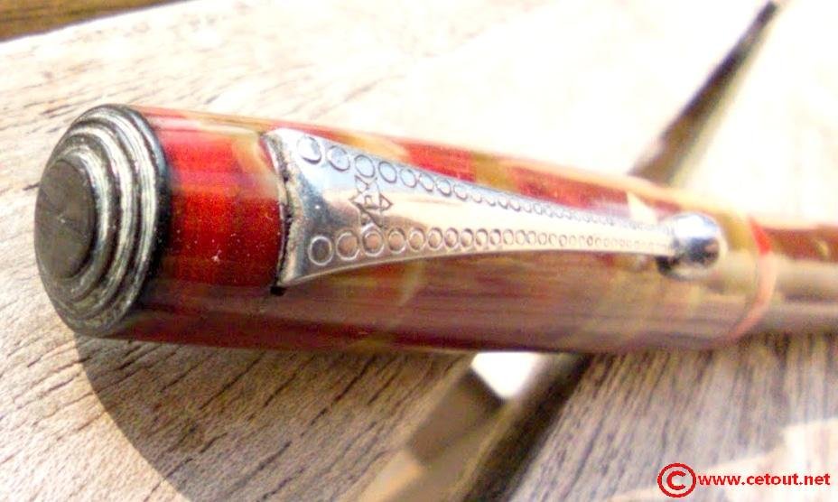 – Capuchon en Celluloïd marbré rouge avec reflets nacrés. Clip métal avec «P» dans une étoile à 6 branches. Très Bon état global.
