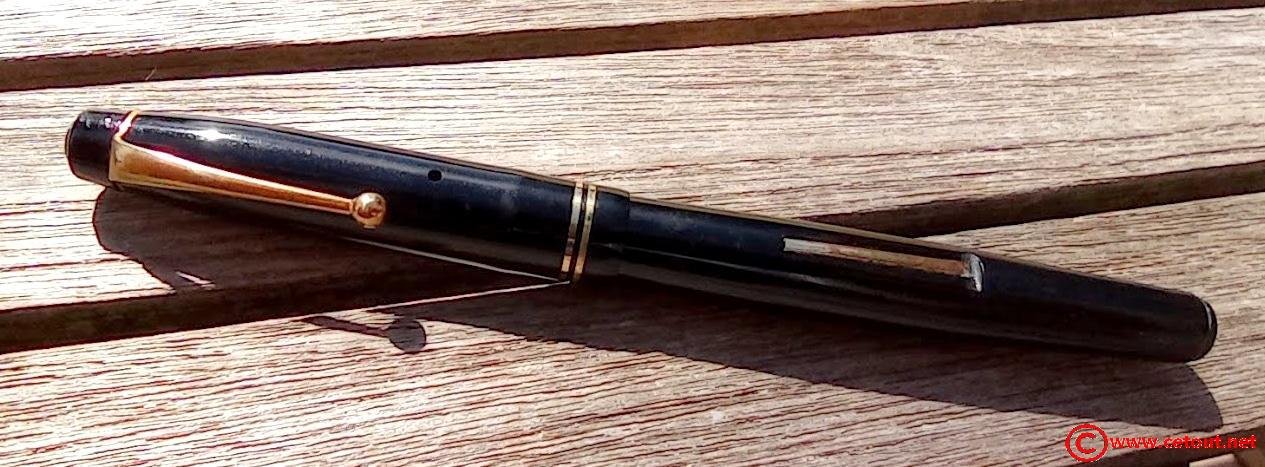 – Capuchon (intact) : Celluloïd Noir. Agrafe dorée (décolorations minimes mais présentes). 2 bagues dorées à la base. Terminaison par une bague en celluloïd. Bon état global.