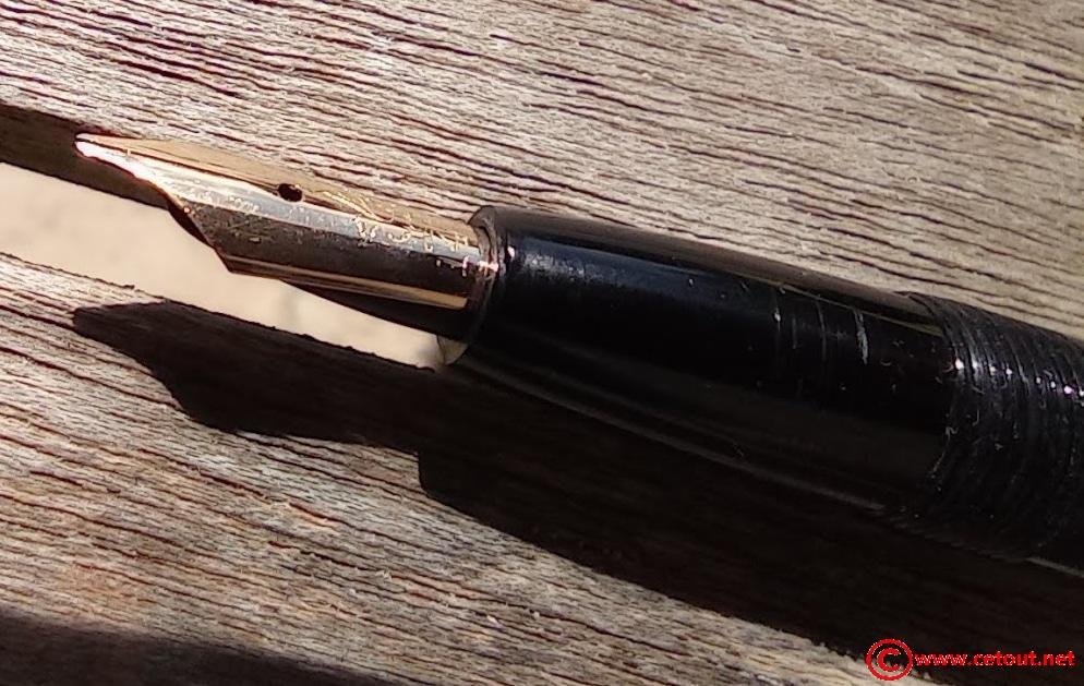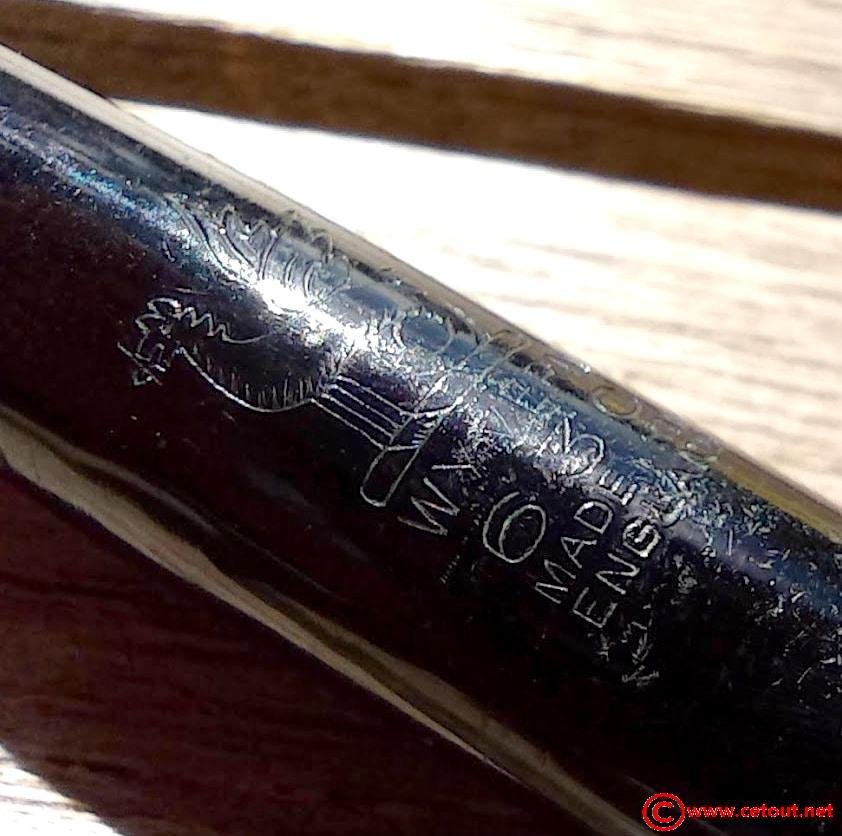 – Corps en Celluloïd Noir. Gravure « symbole de la marque (griffon) » suivi de « WYVERN 630 MADE IN ENGLAND ». Plusieurs impacts d’usure sur la partie supérieure du corps. Terminaison par une bague en celluloïd.