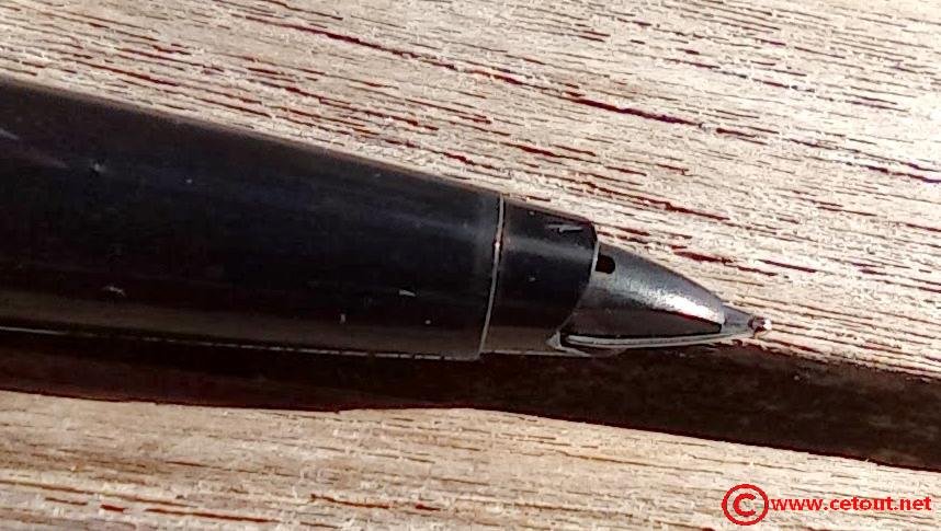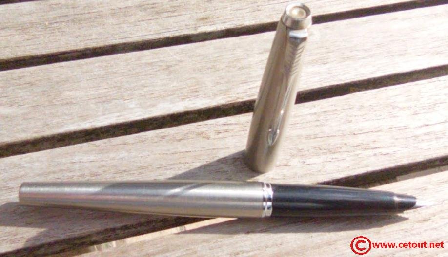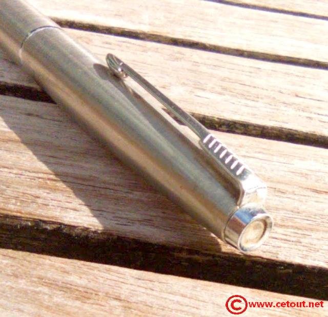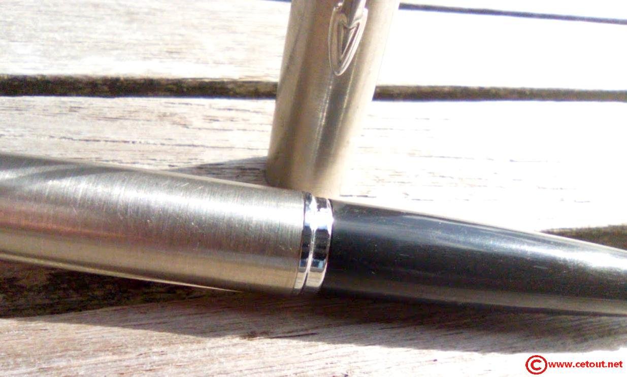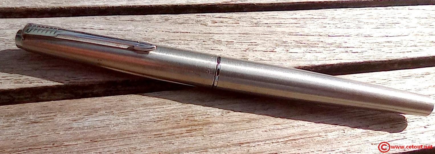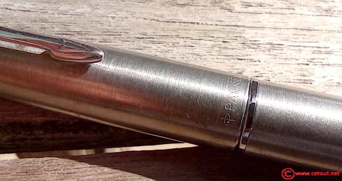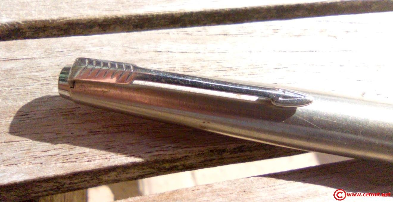 – Capuchon (intact) – métal brossé – agrafe flèche . Bague au sommet. Inscriptions : « Symbole flèche et cercle » suivi de « PARKER – MADE IN France »