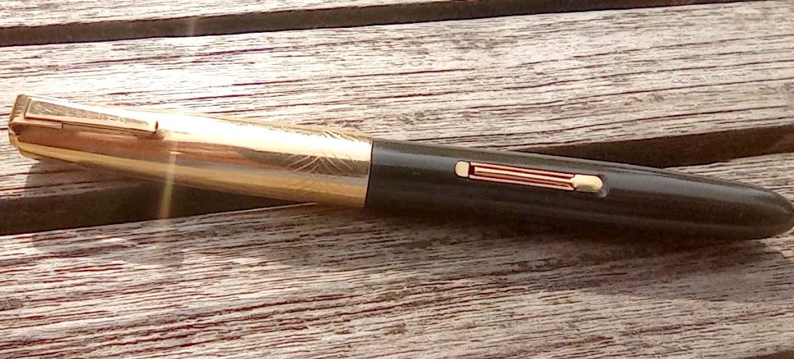 – Corps Celluloid (?) Gris foncé. Sur le pourtour proche de la section (en métal doré pour clipser le capuchon), il est gravé : « WATERMAN’S Made in USA ». Une bague métallique dorée termine le corps à son extrémité. Levier doré.
