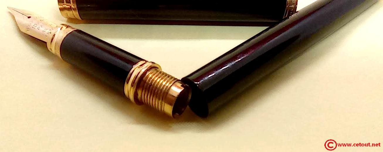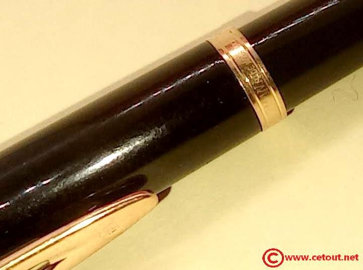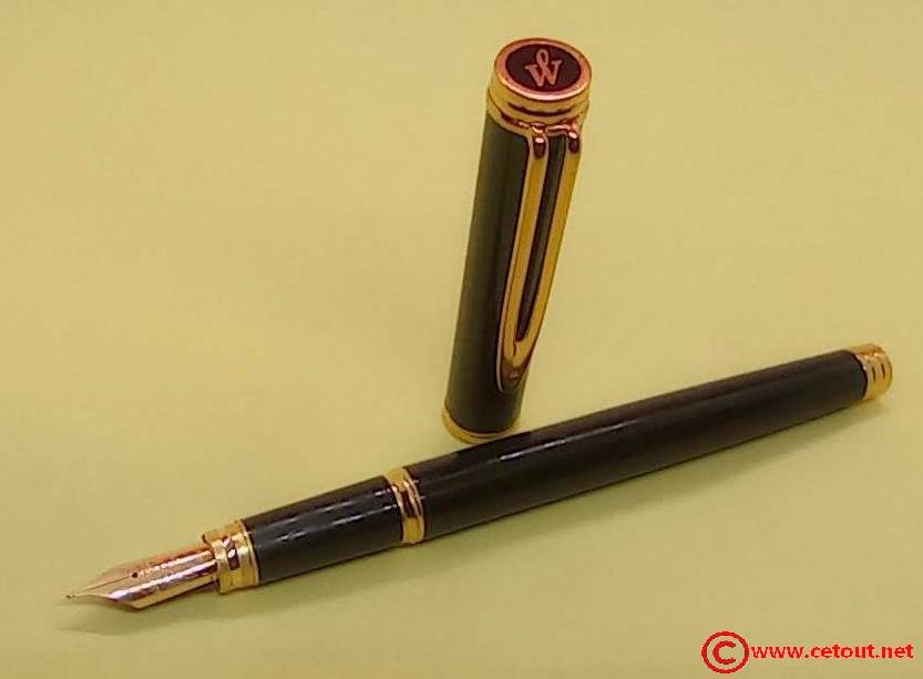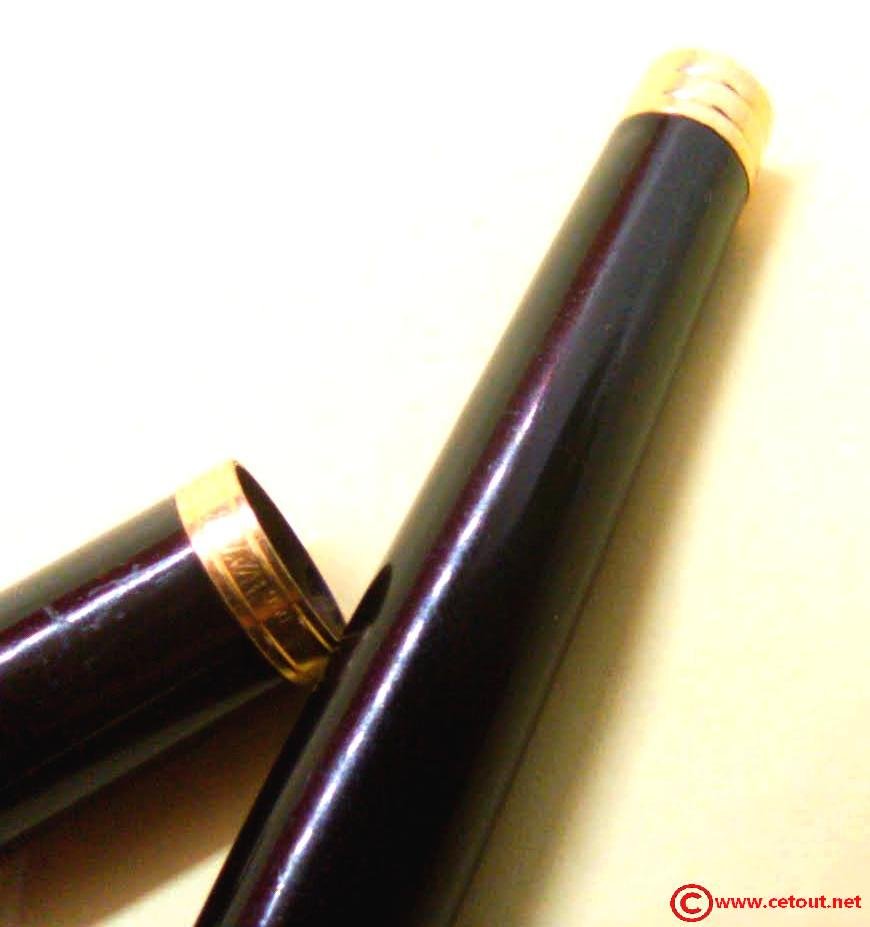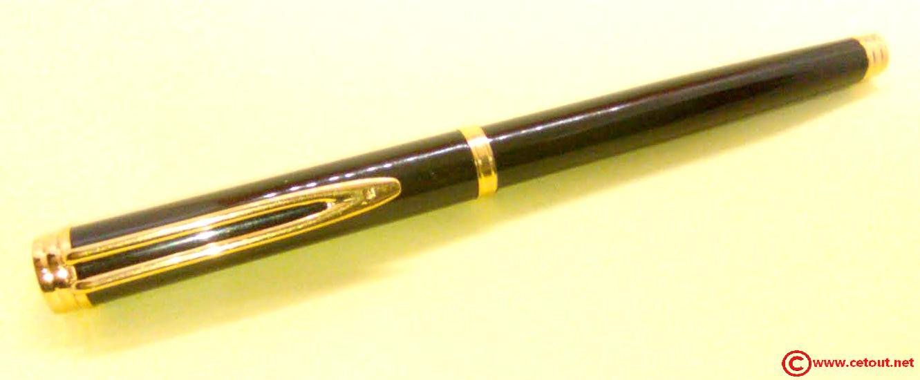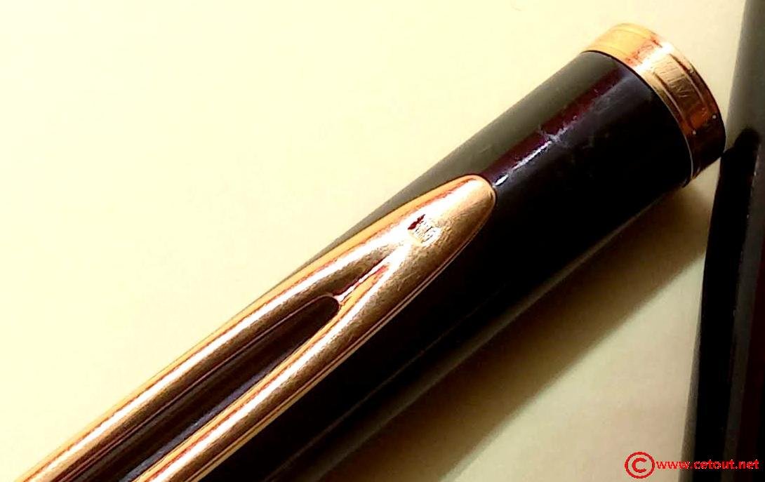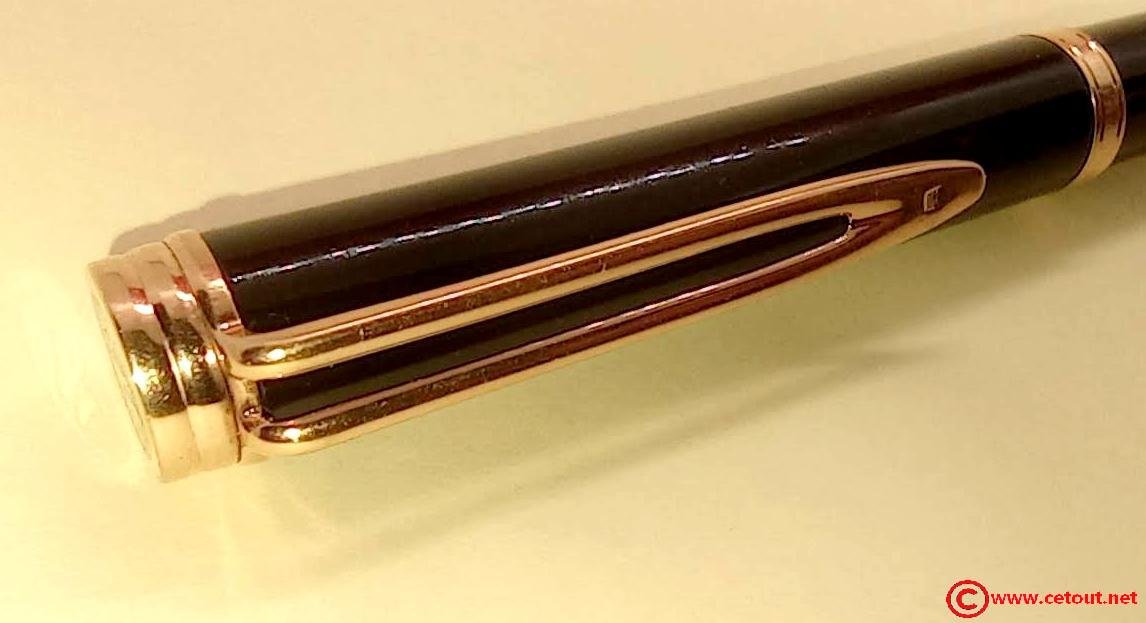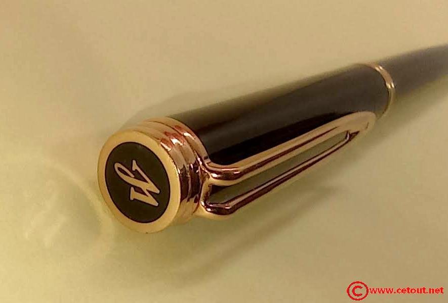 – Capuchon résine laquée noire. Agrafe de capuchon en plaqué or. Une bague dorée au sommet avec Logo W. Une bague dorée à la base du capuchon. Il est gravé : « Plaqué OR G WATERMAN made in France+ poinçon [Wat S.A] »