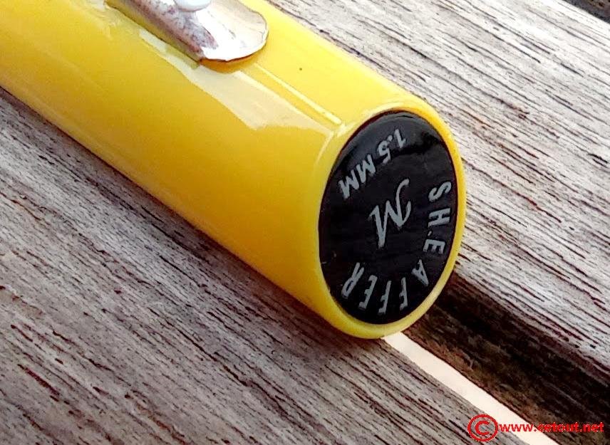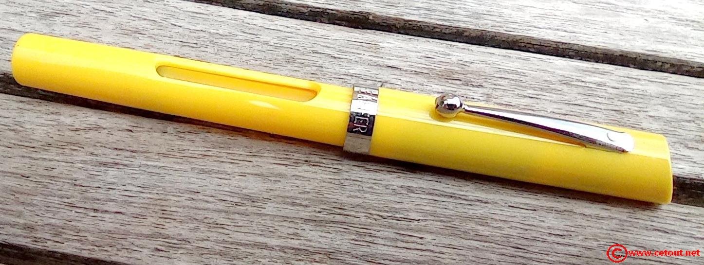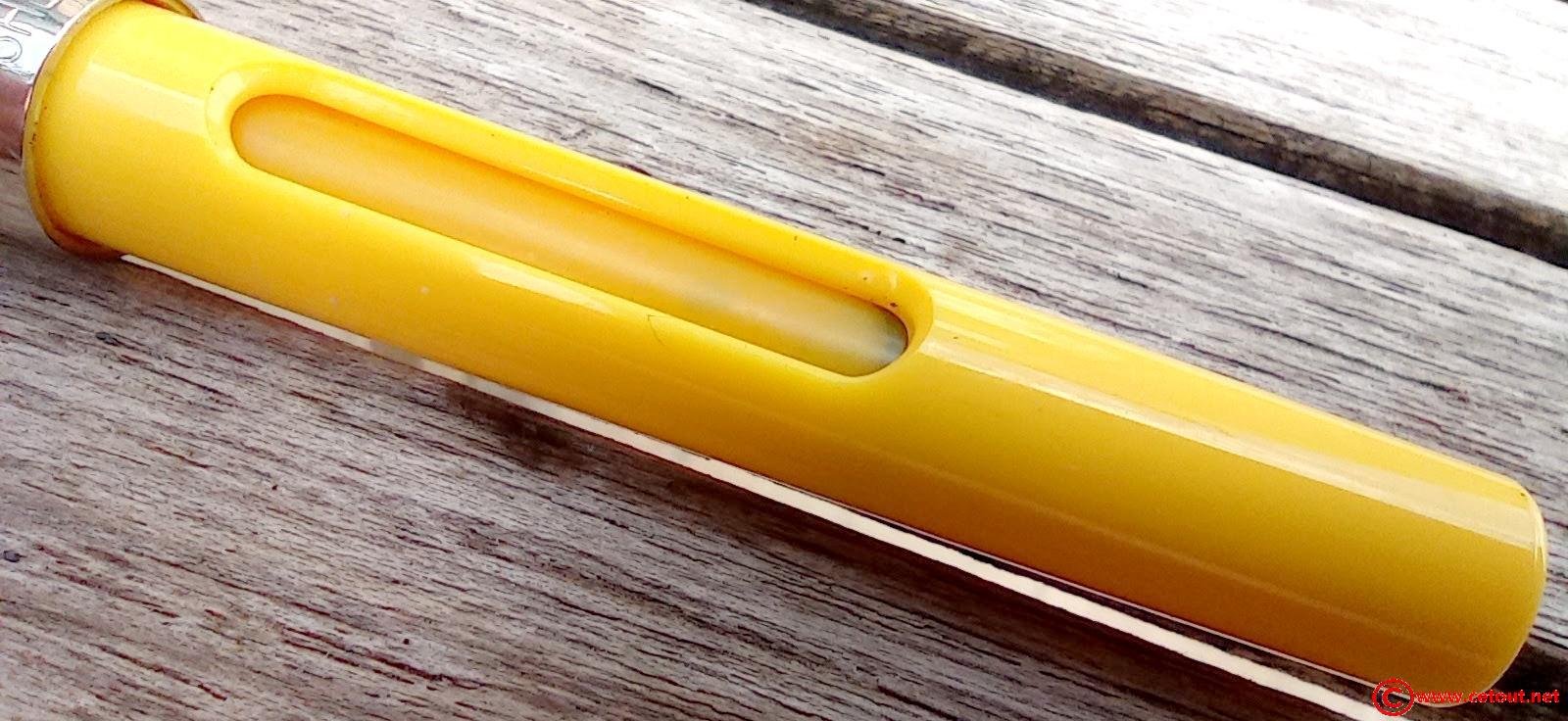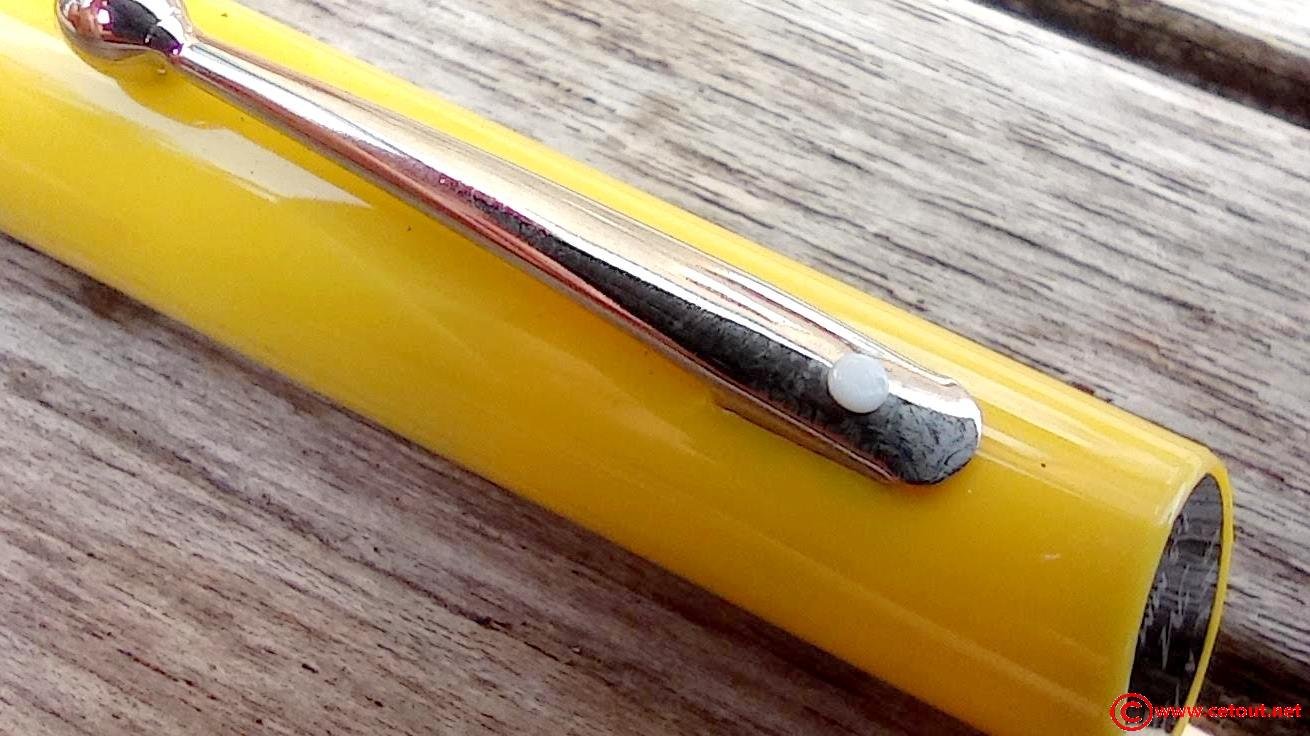 - Capuchon en Polystyrène JAUNE avec bague métal. Clip métal avec point Blanc Sheaffer.