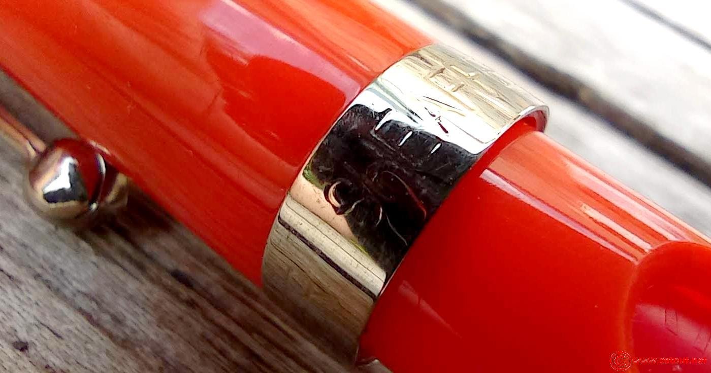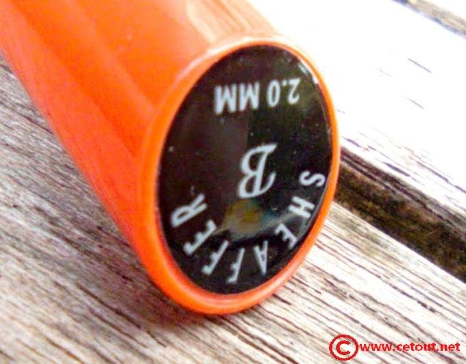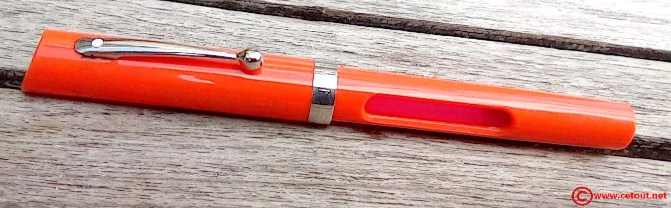 - Capuchon en Polystyrène ORANGE avec bague métal. Clip métal avec point Blanc Sheaffer.