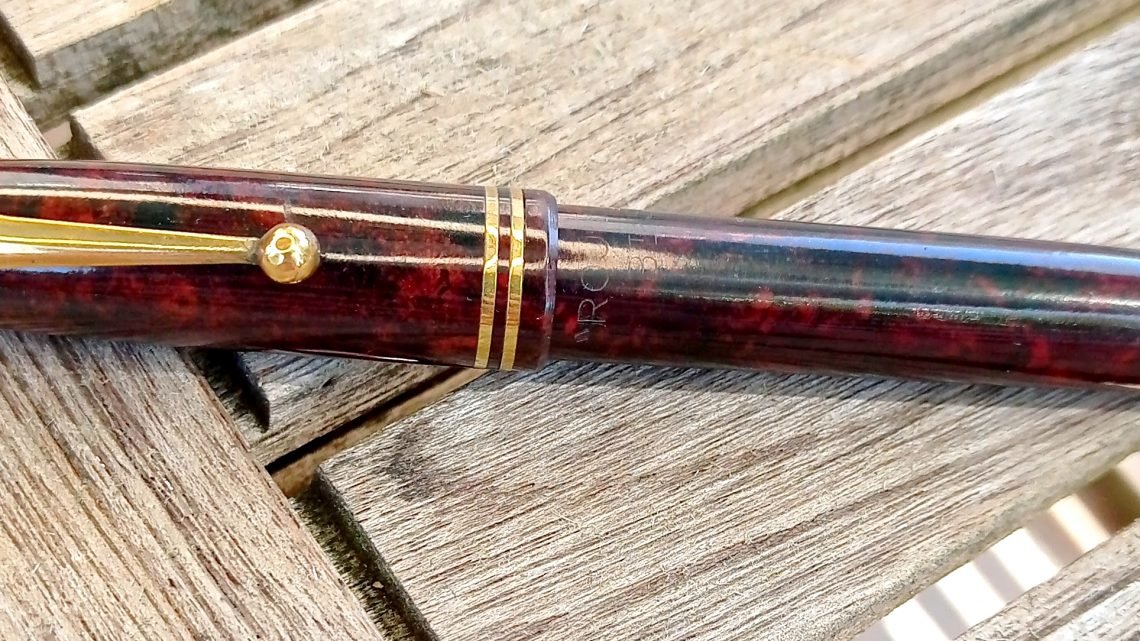 – Capuchon en Celluloïd(?)(on dirait de la Bakélite) marbré rouge. Clip métal doré . 2 Bagues dorées à la base.  Très Bon état global.