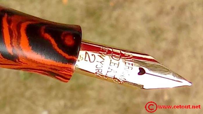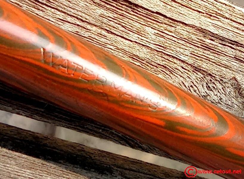 – Bloc plume Ebonite marbrée rouge et noir (RED RIPPLE). Plume WATERMAN avec comme inscription :