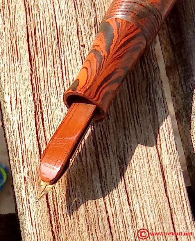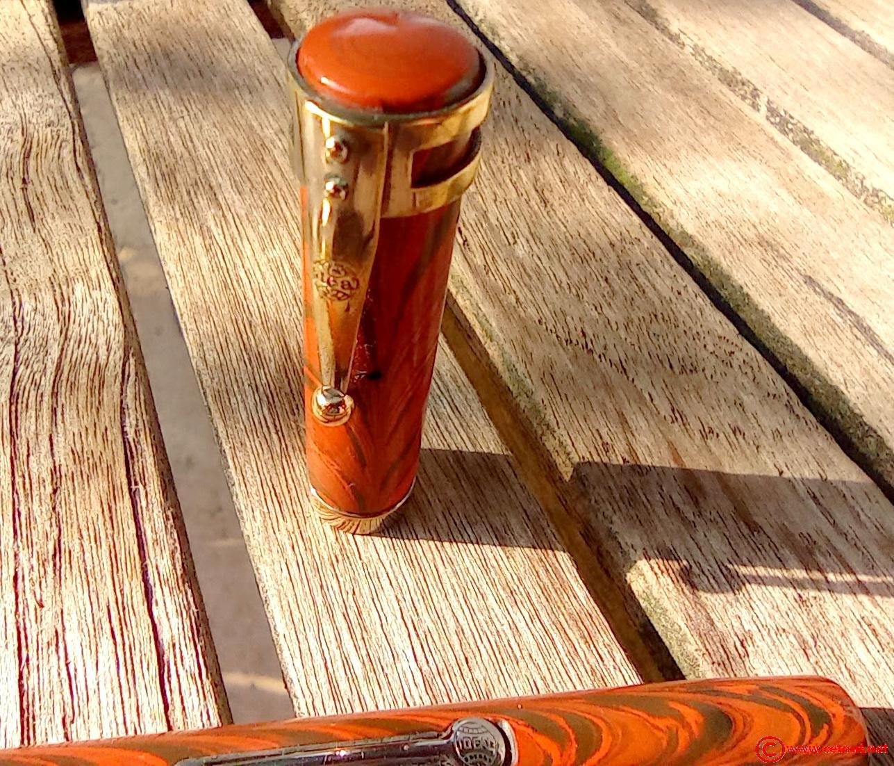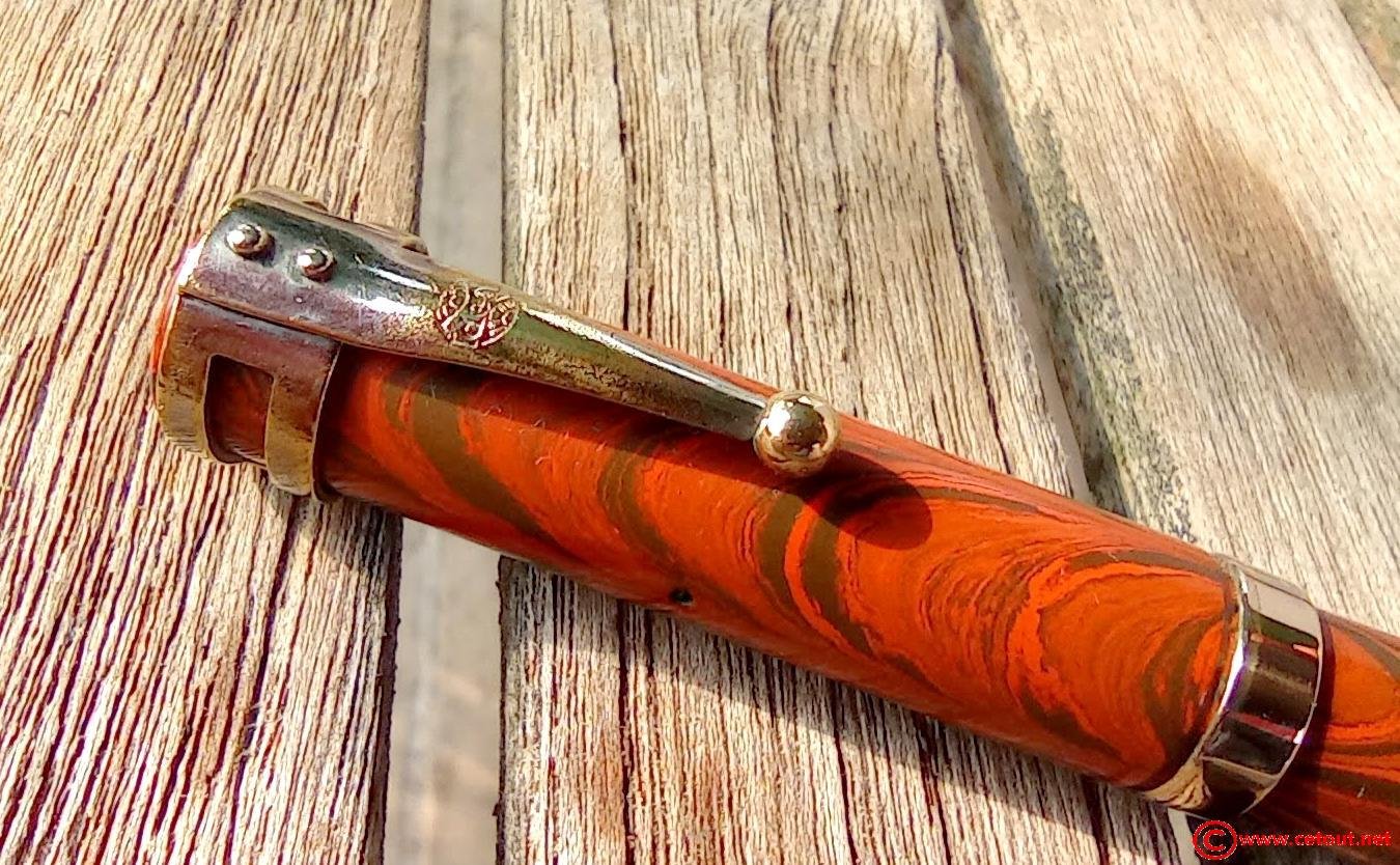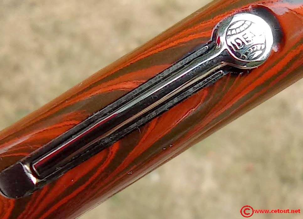 – Capuchon Ebonite marbrée rouge et noir (RED RIPPLE), clip métal avec logo « IDEAL ». Une large bague dorée annelée à la base du capuchon.