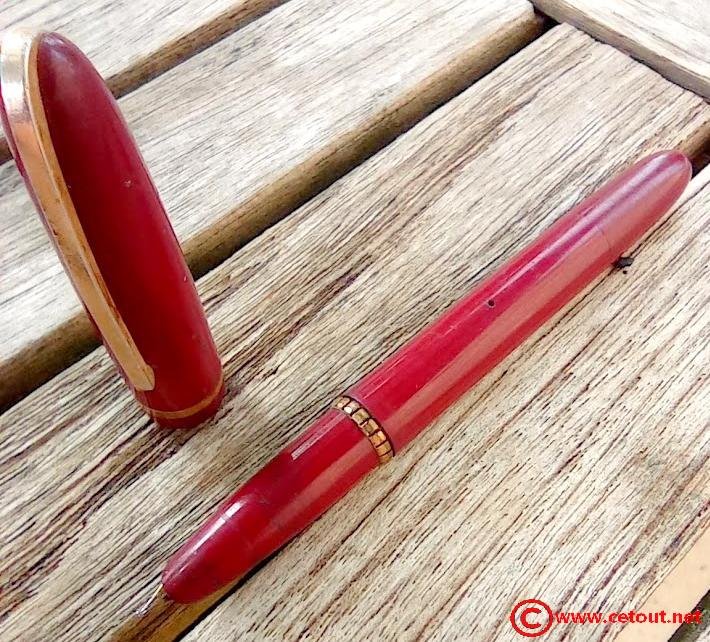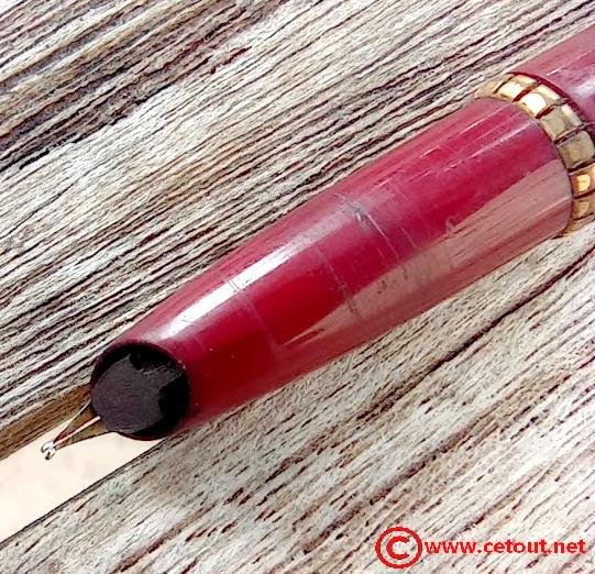 – Bloc plume Celluloïd rouge bordeaux. Traces d’usure. Plume probablement OR (non démontée) – Becs abimés à voir – (reste caché) ».