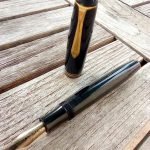 – Capuchon en celluloïd noire. 2 bague fines entourant une bague plus large le tout doré à la base. Agrafe forme spécifique (genre cravate). Bon état global.