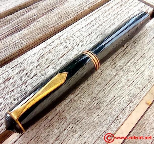 – Capuchon en celluloïd noire. 2 bague fines entourant une bague plus large le tout doré à la base. Agrafe forme spécifique (genre cravate). Bon état global.