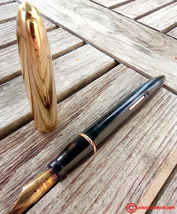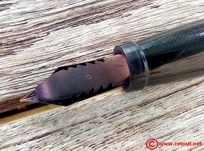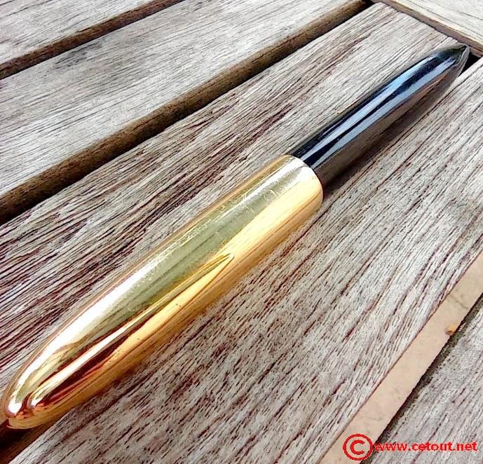 – Corps Celluloïd(?) Noir. Il est gravé dans la matière: « METEORE 339» stylisé. Une bague dorée sépare le bloc plume du corps et sert de clip pour la fermeture du capuchon.