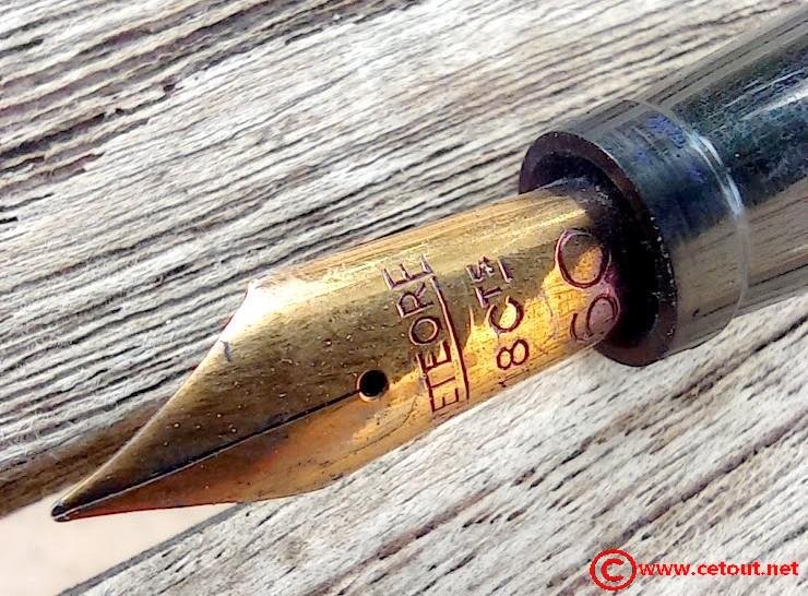 – Bloc plume Celluloïd ou Ebonite(?) noir. Plume OR (non démontée) avec inscriptions : “METEORE 18 cts 60” – Taille Fine à moyenne.