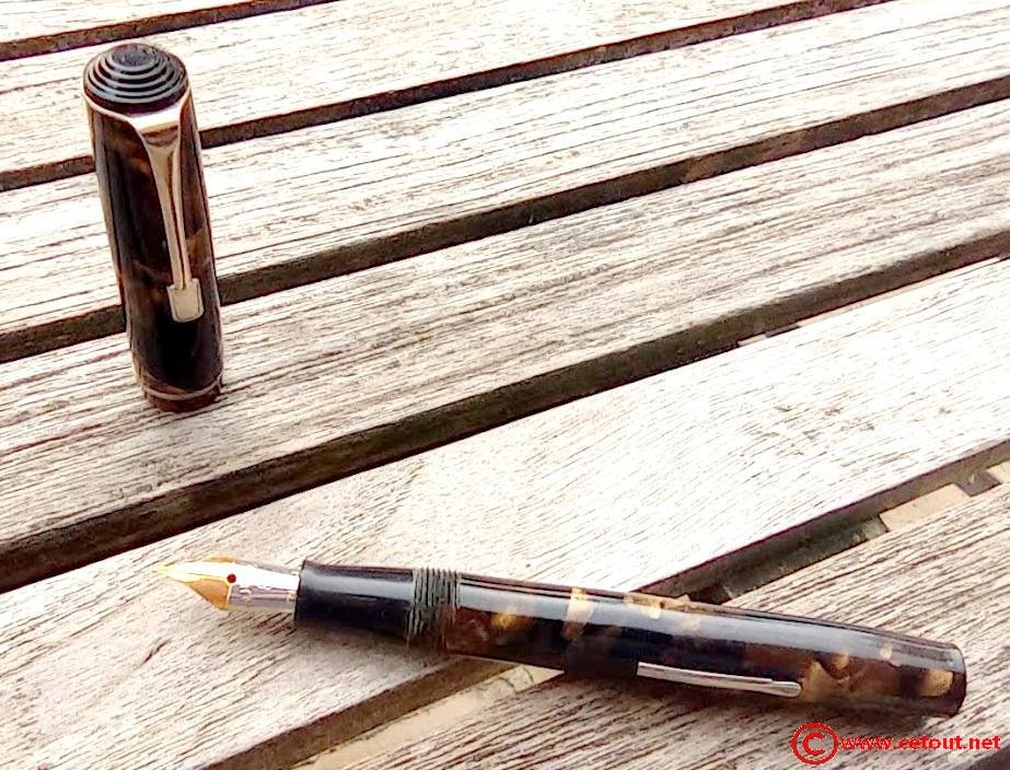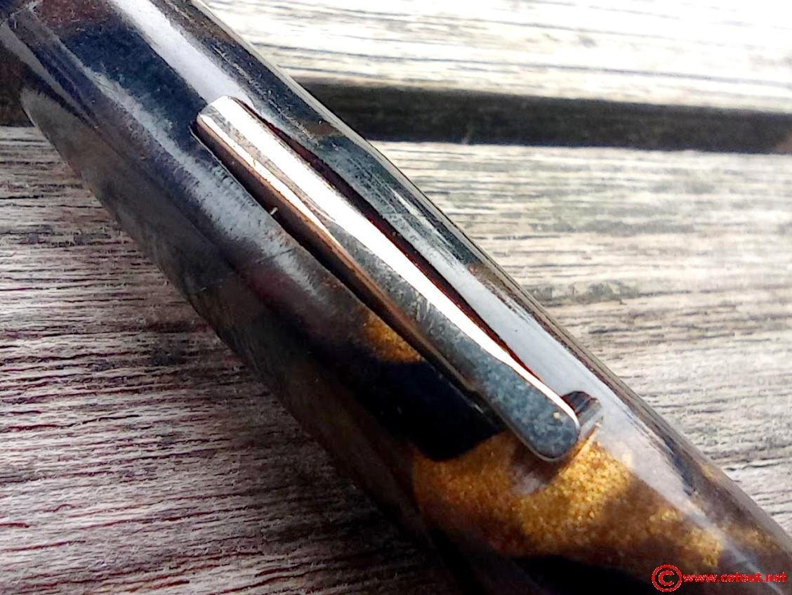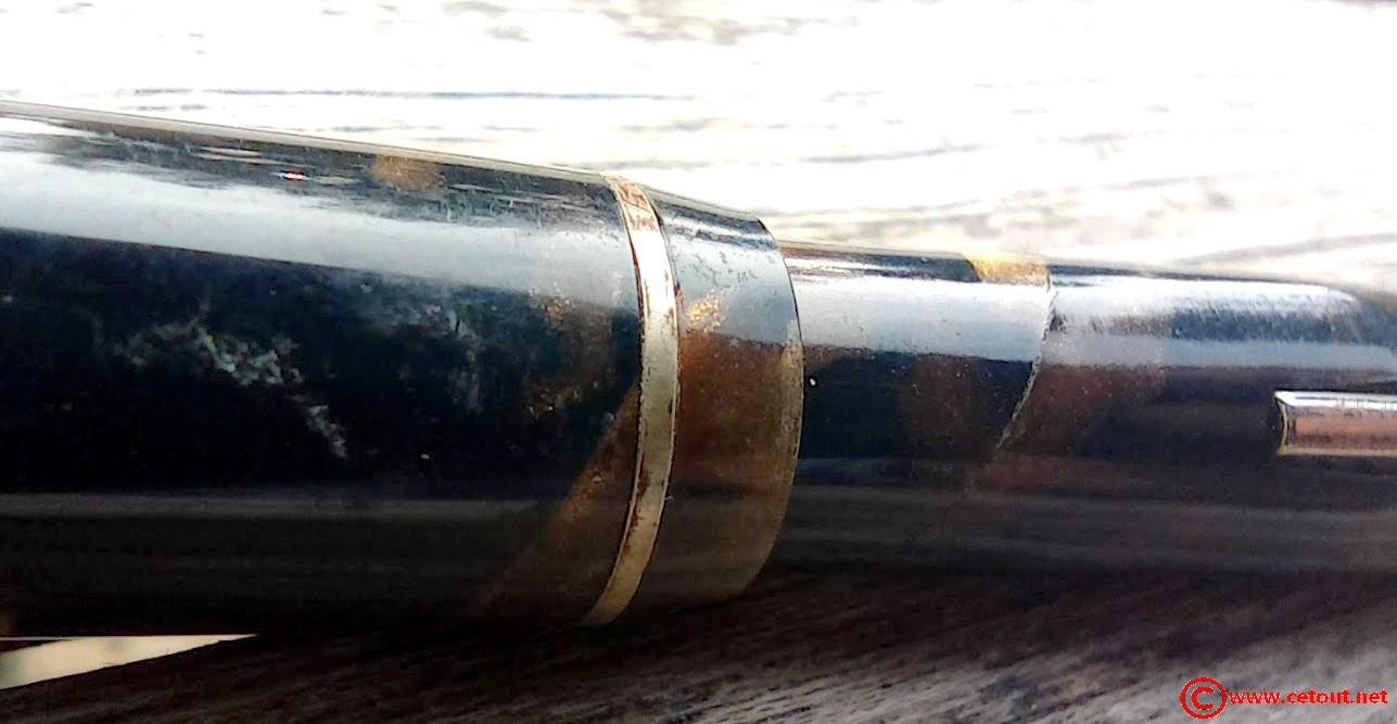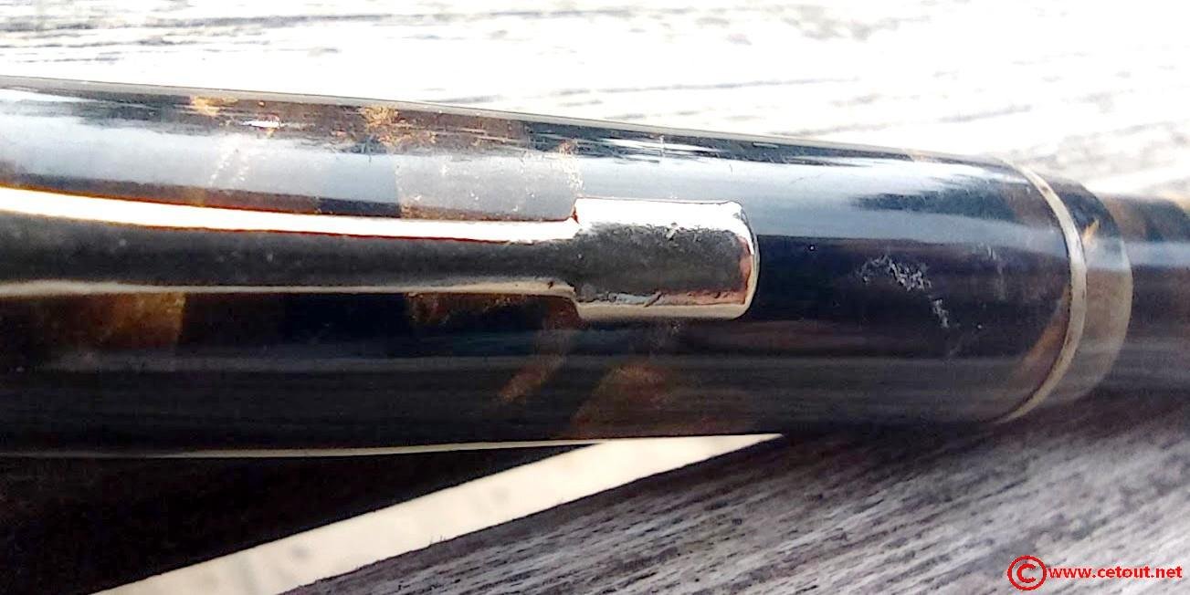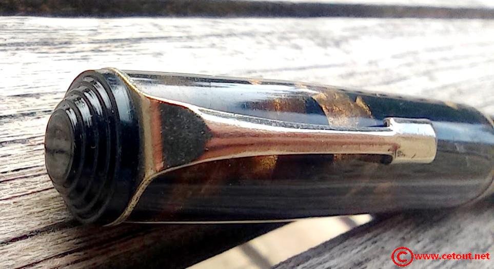 Capuchon : CELLULOID? marbré marron jeune et noir. Agrafe en métal bon état. Forme caractéristique. Une bague métal doré fine à la base.