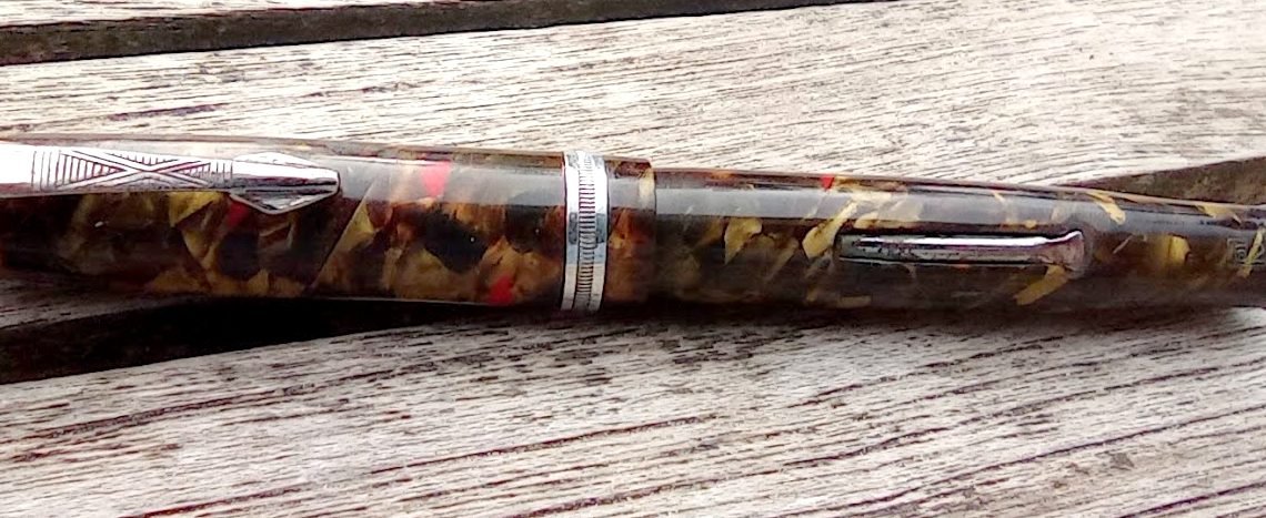 Corps : CELLULOID? marbré marron, jaune rouge nacré et noir. Bague métallique en bout. Mécanisme à levier. Non fonctionnel. Numéro 52 dans cadre gravé au bout du stylo.