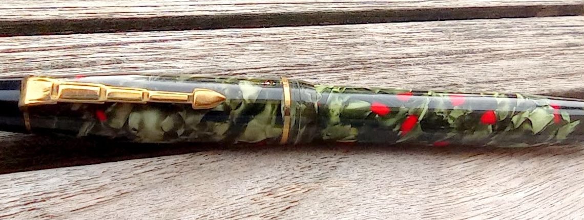 Corps : CELLULOID? marbré vert rouge nacré et noir. capuchon noir en bout. Mécanisme à levier (un peu déformé).  Fonctionnel.