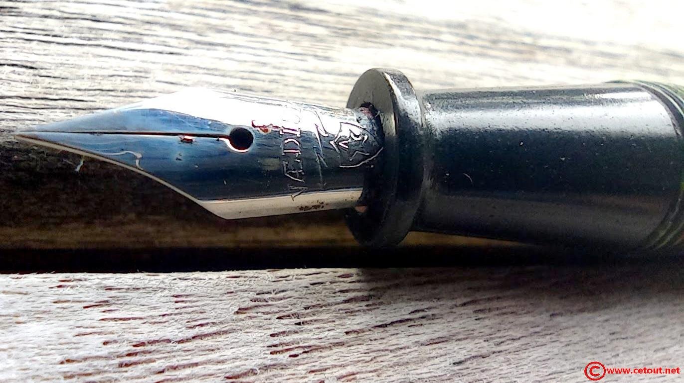 Corps : CELLULOID? marbré vert rouge nacré et noir. capuchon noir en bout. Mécanisme à levier (un peu déformé). Fonctionnel.