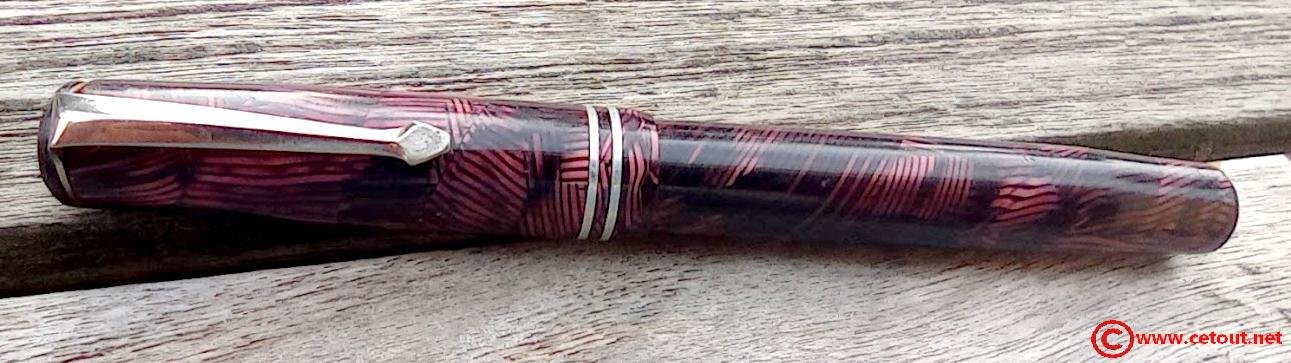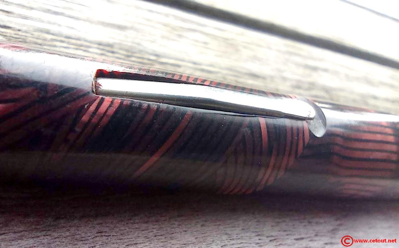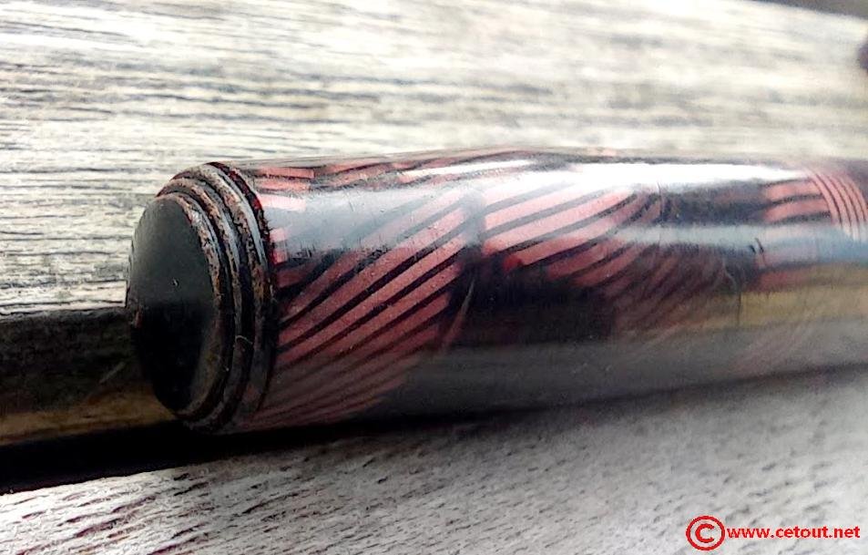 Capuchon : CELLULOID? motifs zébrés rouge et noir. Agrafe en métal Bon état.