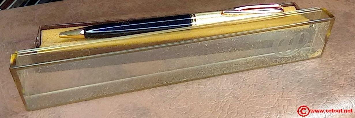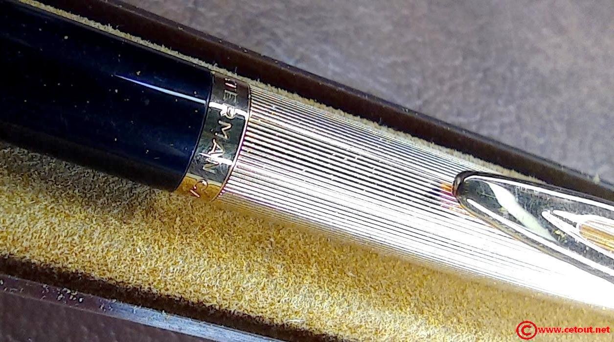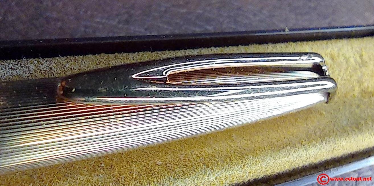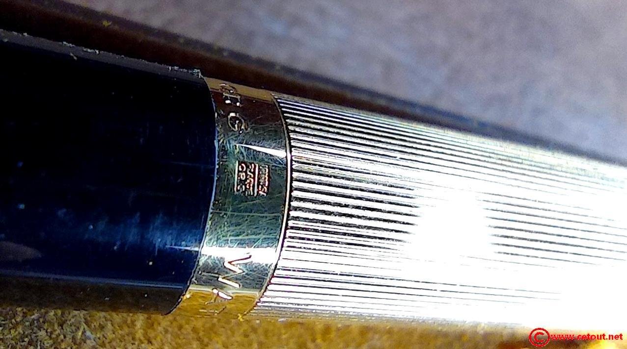 – Capuchon en métal doré strié avec poinçon. Clip doré spécifique Waterman C/F. Inscription gravée à la base : « WATERMAN C/F plaqué OR G + poinçon ».