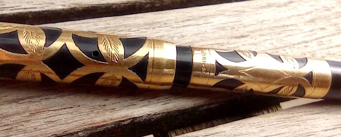 Corps noir (ébonite?) avec résille métal doré (filigree). gravure sur le corps: “1/20 – 18KT”