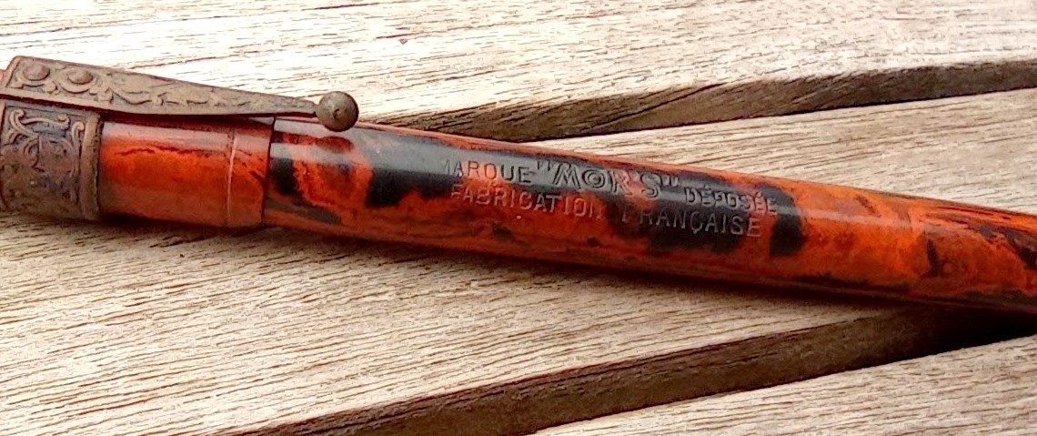 – Corps Ebonite marbrée (woodgrain). Gravure ‘MARQUE “MOR’S” DEPOSEE” puis “FABRICATION FRANCAISE”.