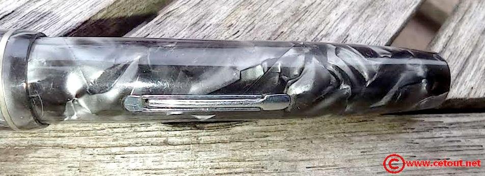 – Capuchon Celluloïd marbré Vert-Gris, clip métal doré avec inscription « WATERMANS ». une bague métal à la base du capuchon.