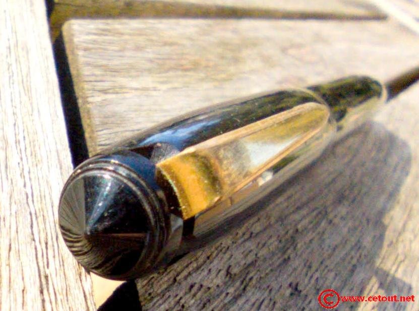 – Capuchon en celluloïd noire. 2 bague fines entourant une bague plus large le tout doré à la base. Agrafe forme spécifique (genre cravate). Bon état global.