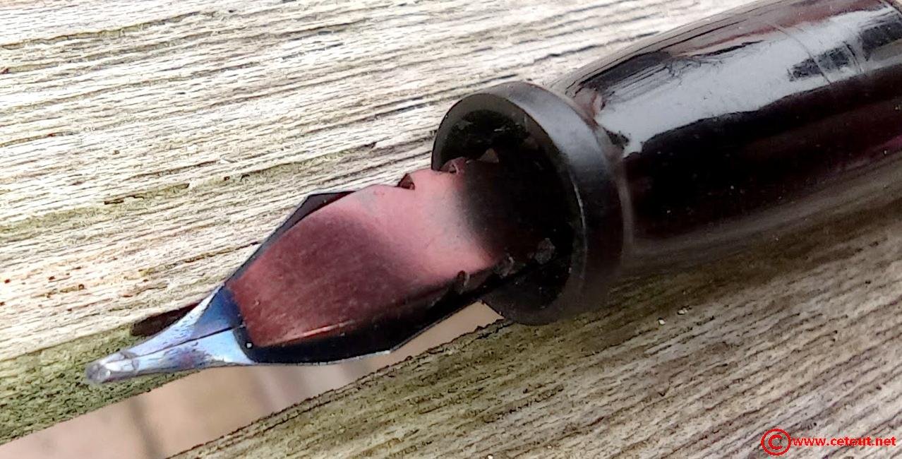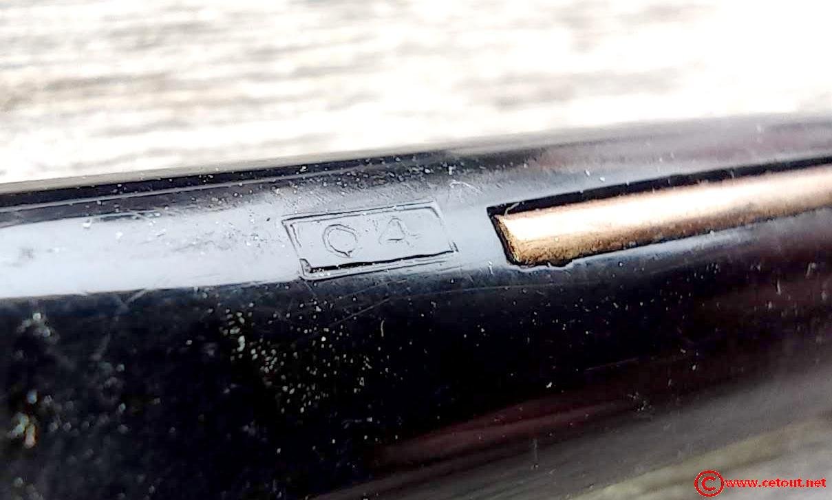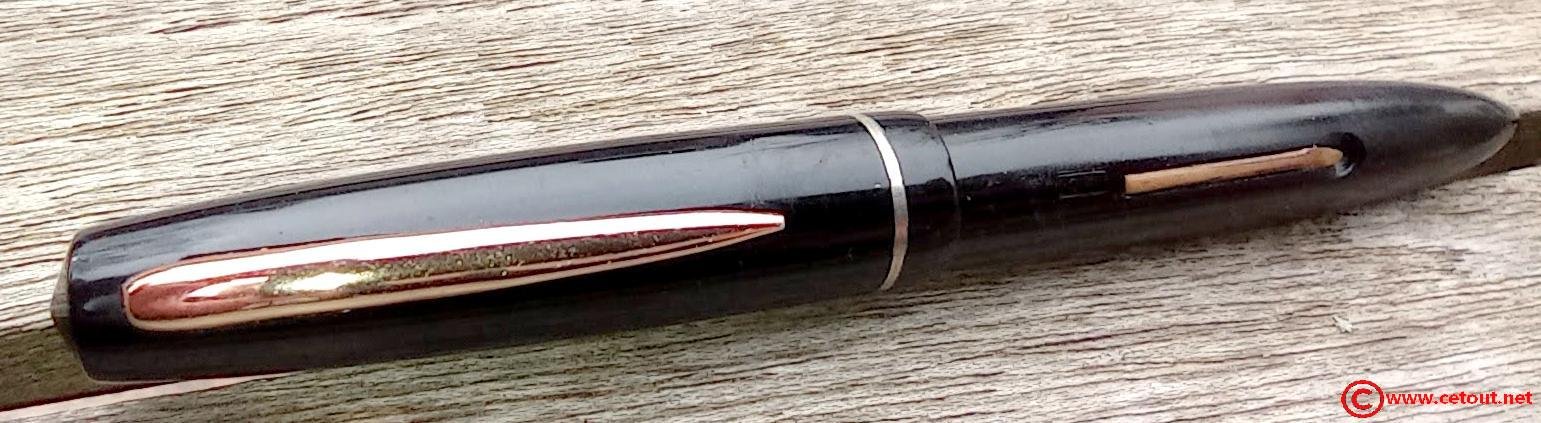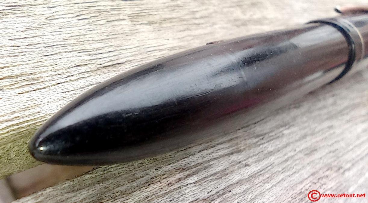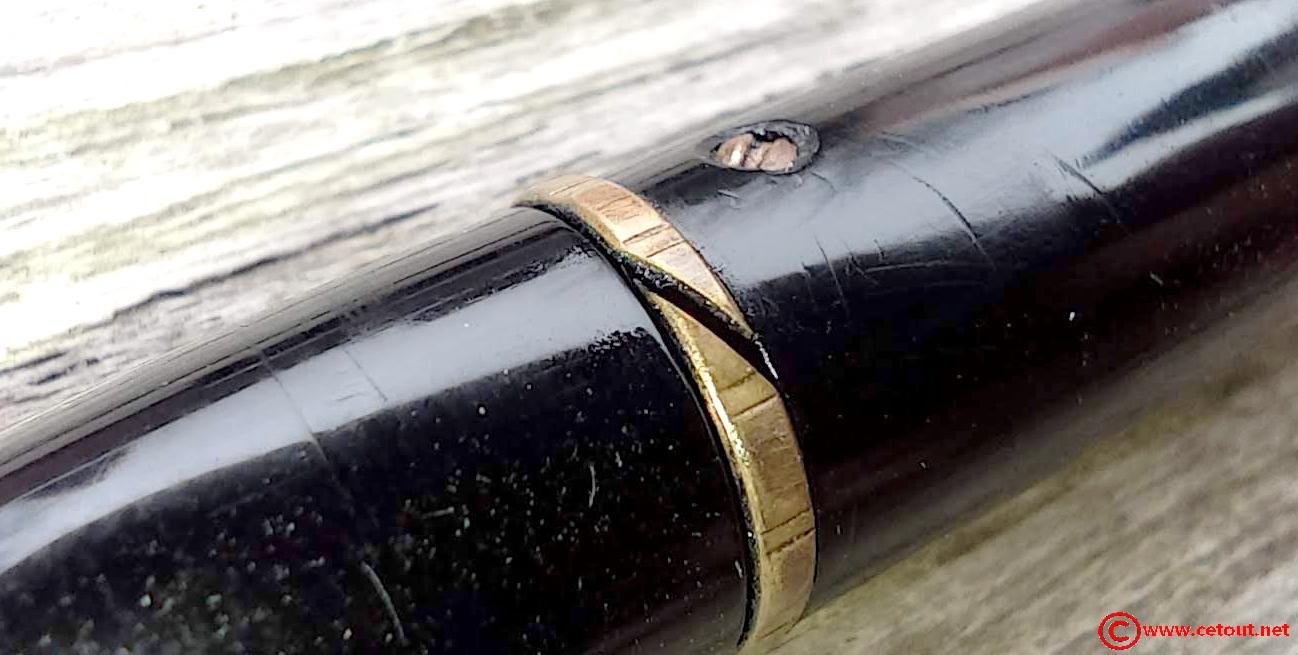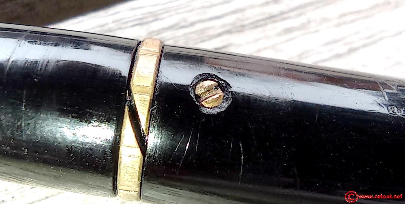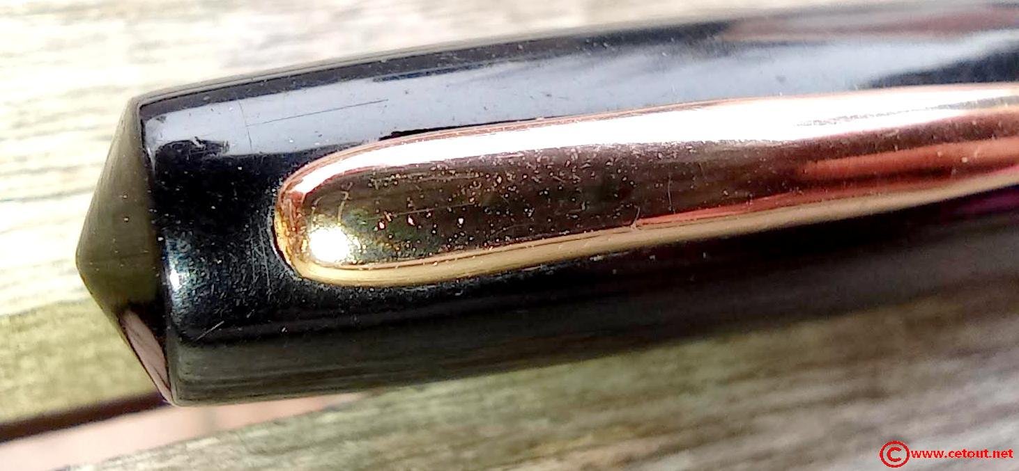 – Corps Celluloïd(?) Noir. Il est gravé dans la matière: « METEORE 515» stylisé. Puis « Bte S.G.D.G MARQUE DEPOSEE ». Une bague dorée sépare le bloc plume du corps et sert de clip pour la fermeture du capuchon. Une vis est également présente.