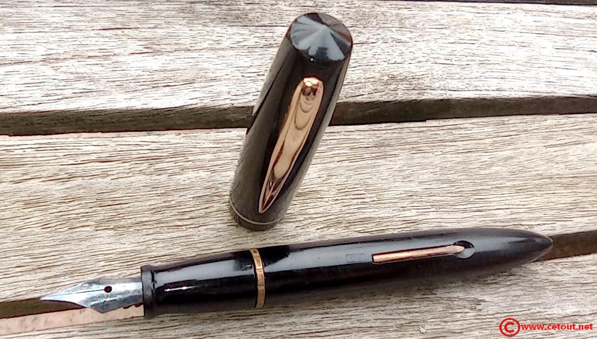 – Bloc plume Celluloïd(?) noir. Plume probablement Inox (non démontée) – Taille Fine à moyenne.