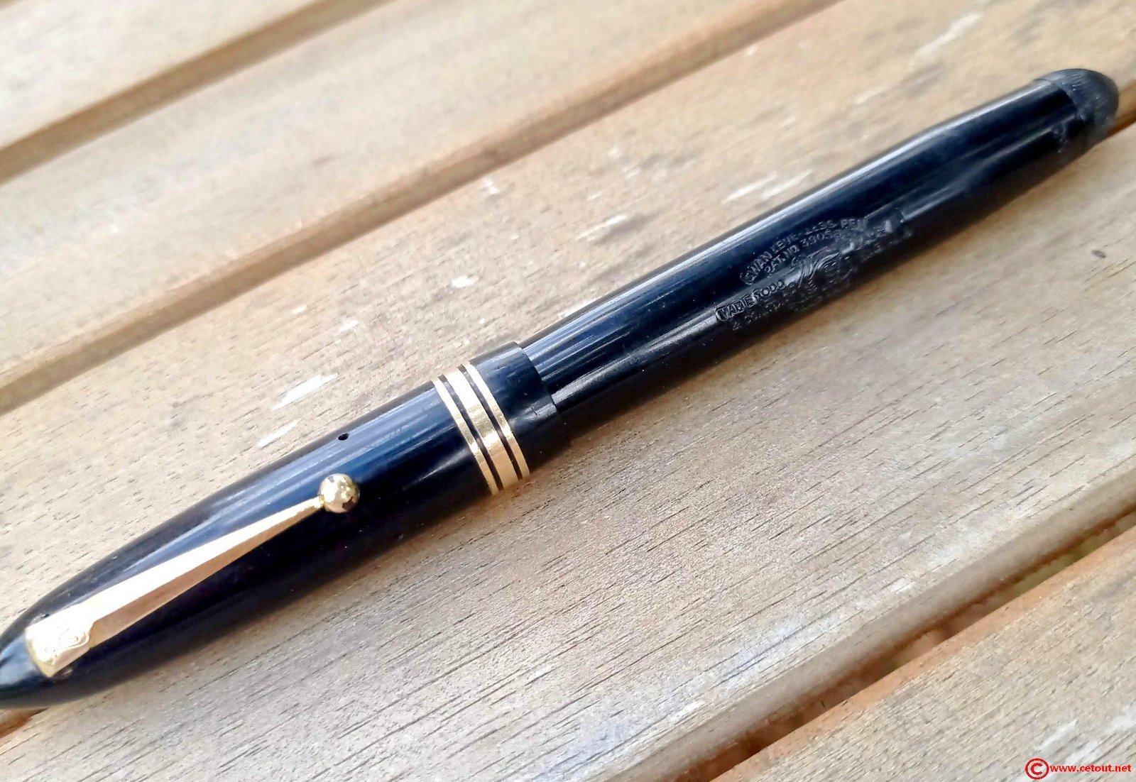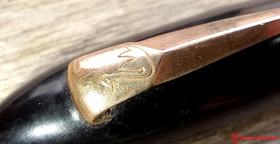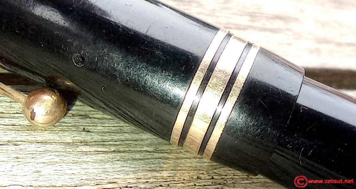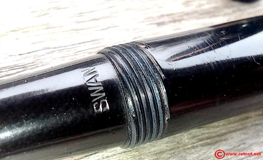 – Capuchon (intact) Celluloïd noir avec clip et bagues dorées. Clip avec logo gravé de la marque SWAN (Cygne).