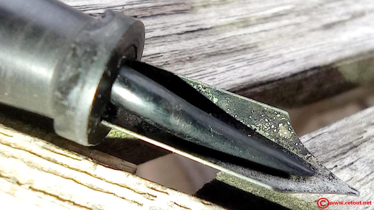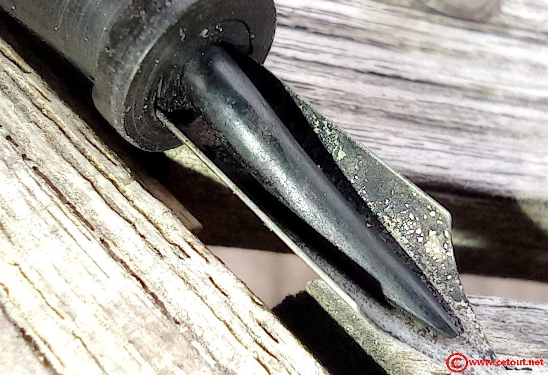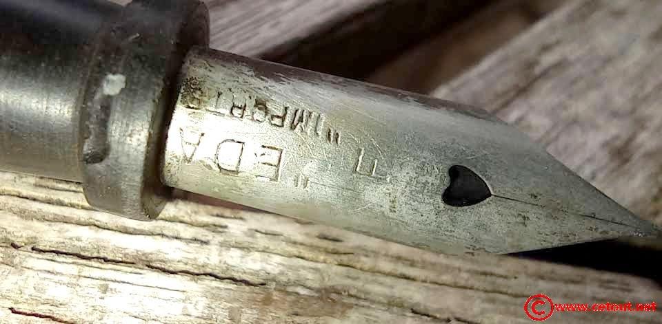 Plume métal “EDAC + IMPORTE”. Le feed est assez particulier car il s’agit d’une tige recourbée vers la plume qui se termine en pointe.