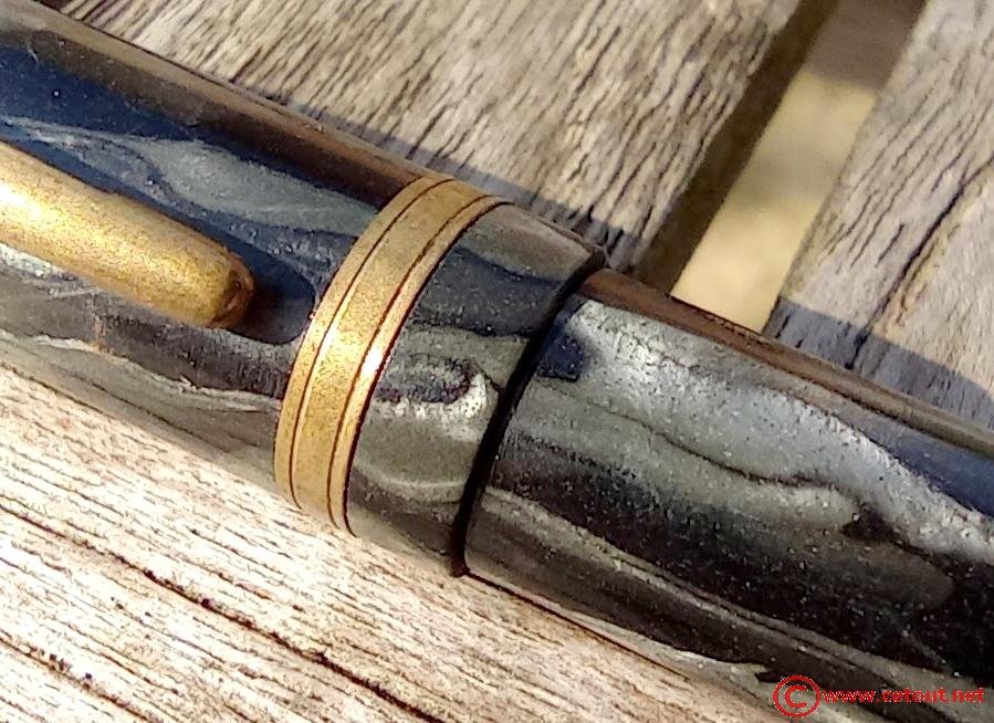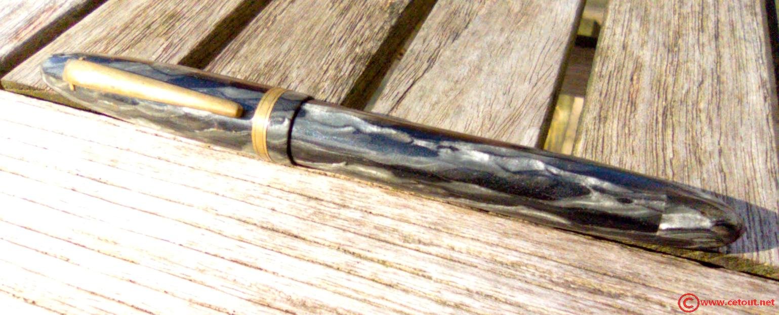 – Capuchon celluloid(?) marbré vert nacre et noir- clip doré sans marquage . Aucune Inscription. Une bague large dorée à la base.