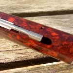 - capuchon marbré façon bakélite avec 1 bague métallique à la base (bon état). Clip métallique avec forme caractéristique (genre Edacoto).