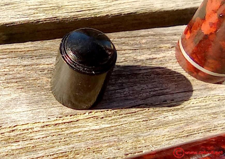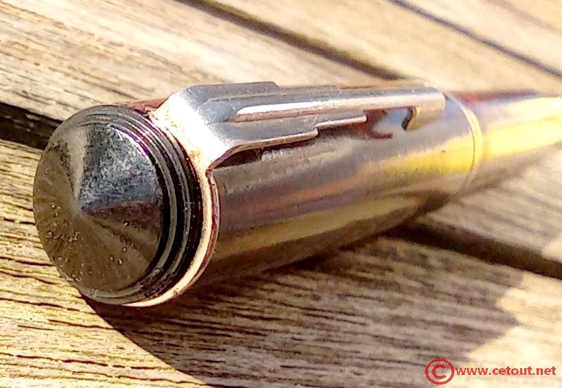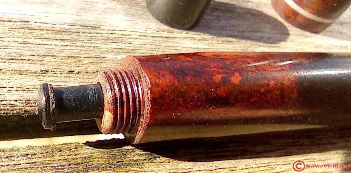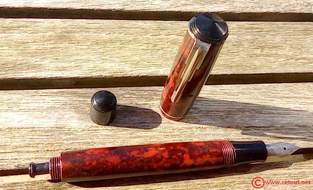 - capuchon marbré façon bakélite avec 1 bague métallique à la base (bon état). Clip métallique avec forme caractéristique (genre Edacoto).