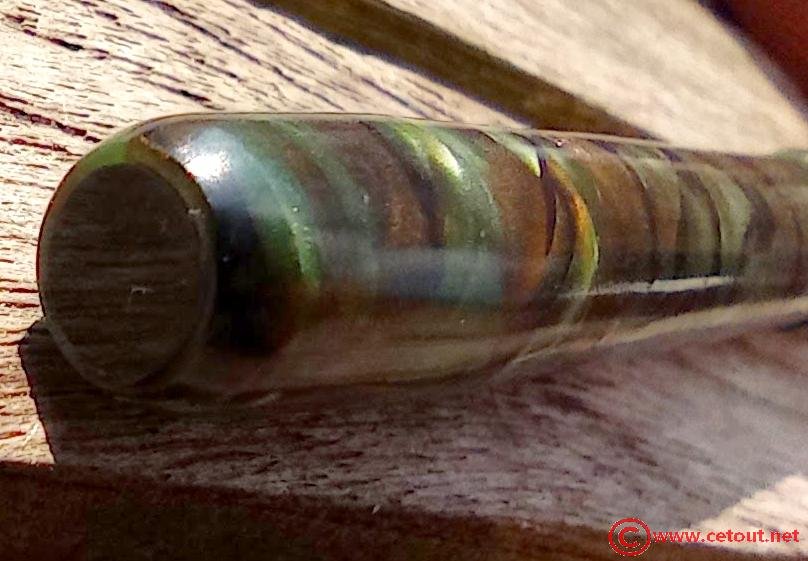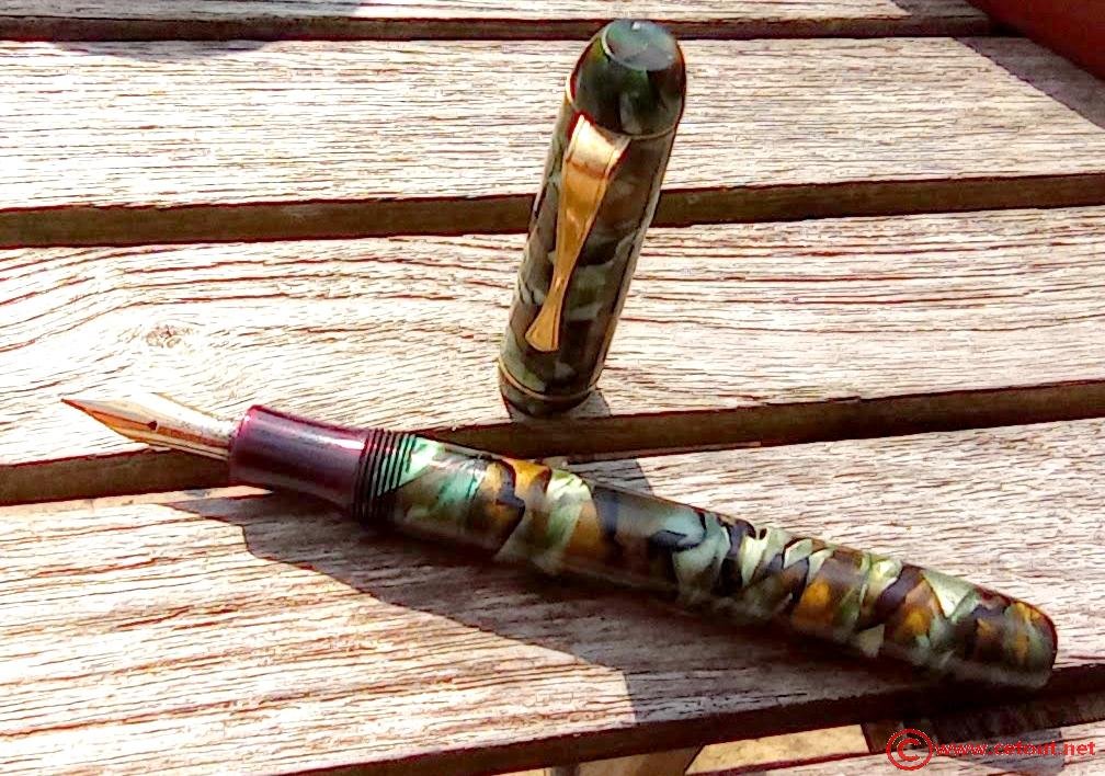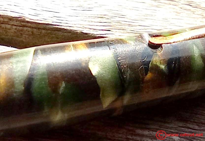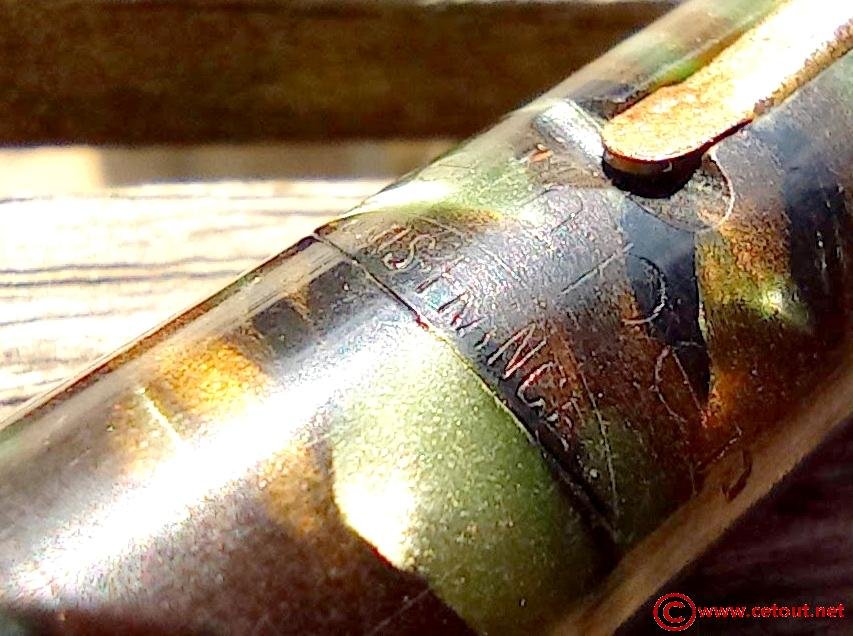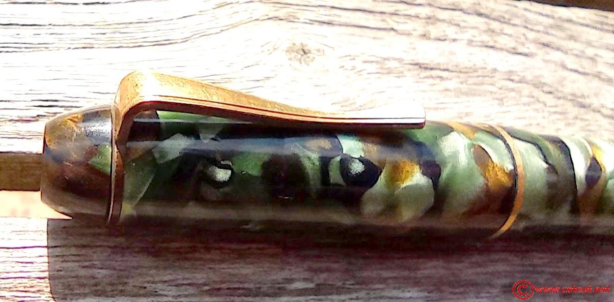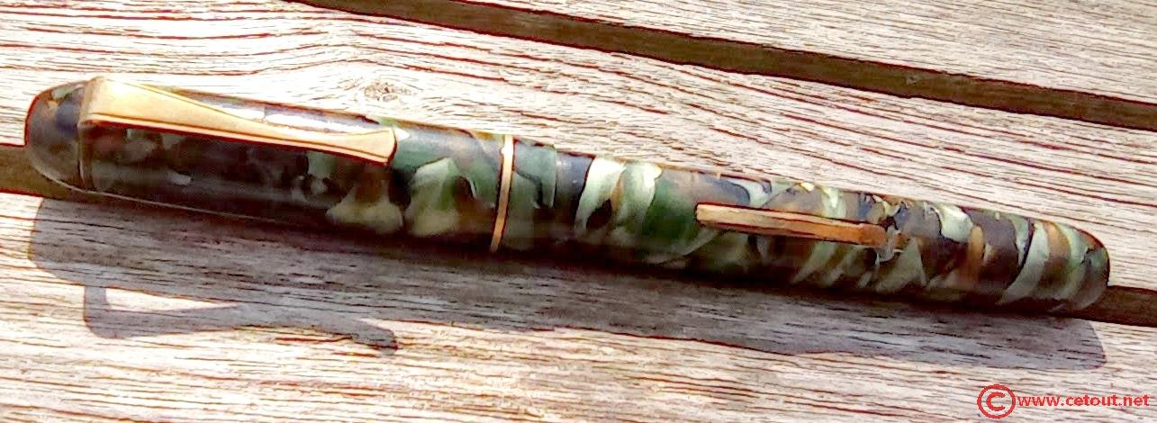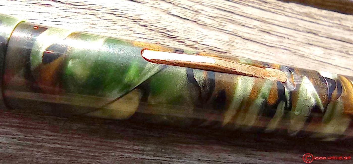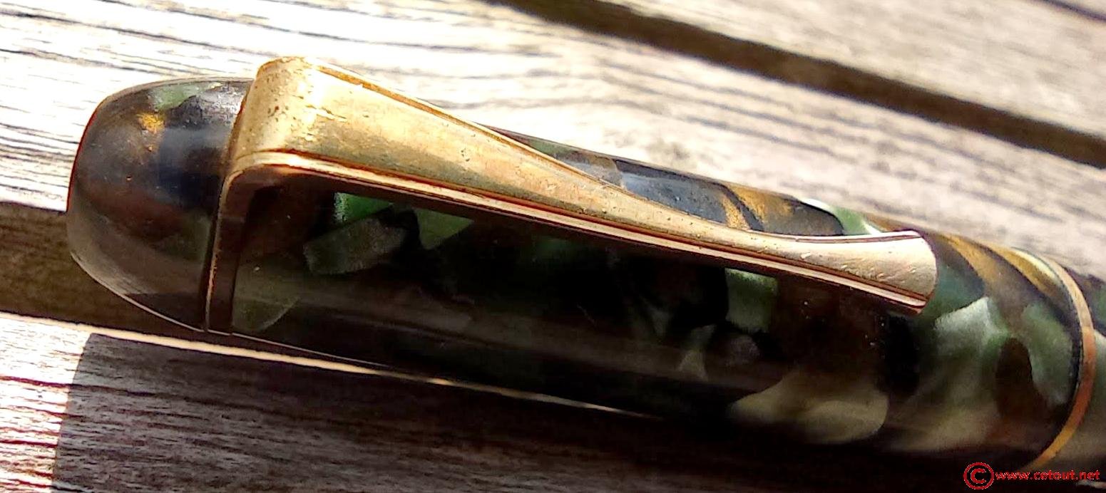 – Capuchon en celluloïd? marbrée (Marbré Vert Marron Nacre). Clip décoré en laiton (?). Bon état global.