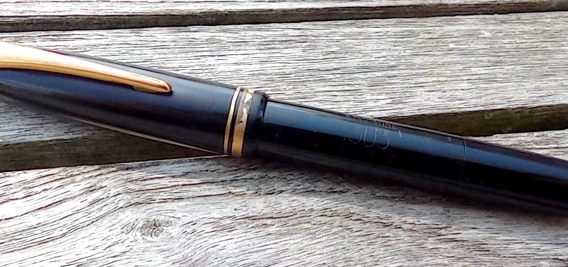 – Bloc plume Celluloïd noir. Plume OR ? (non démontée et carénée) ».