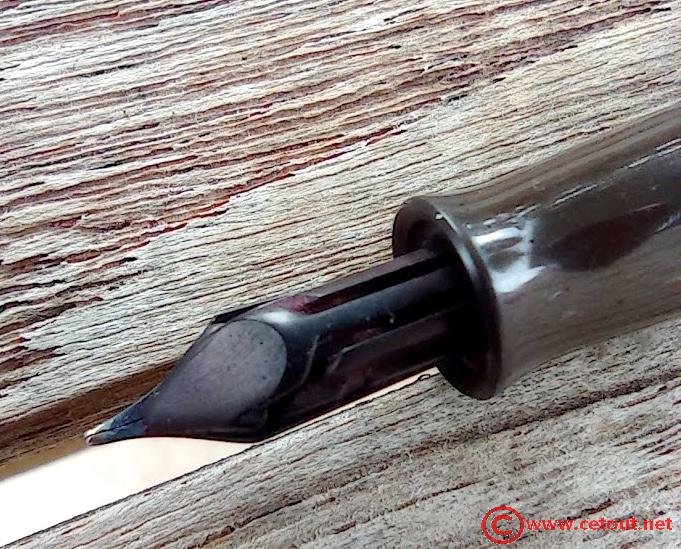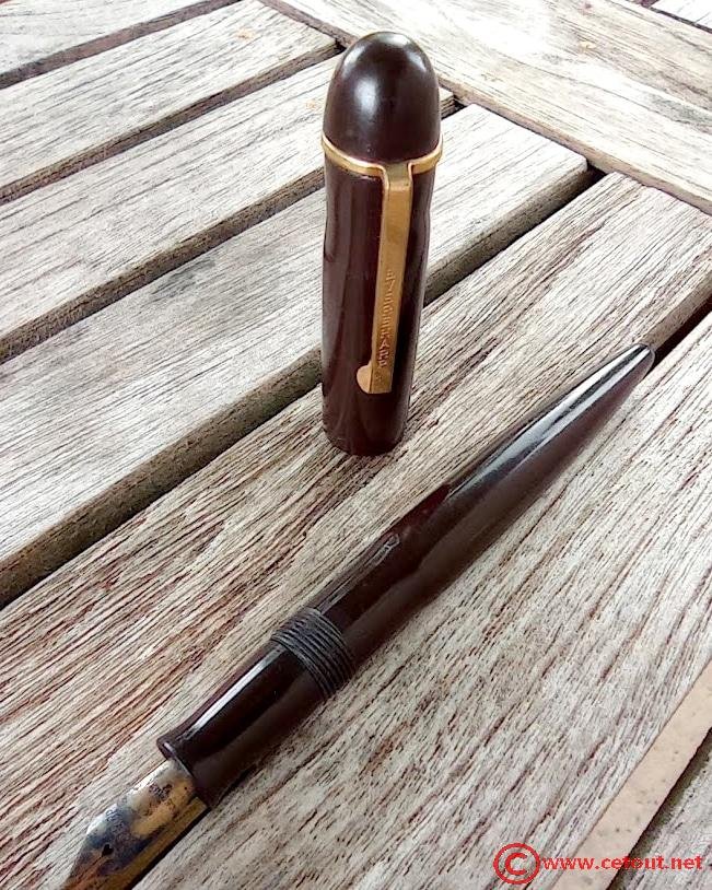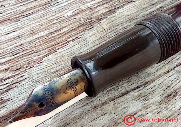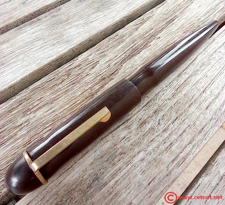 Il s’agit ici d’un modèle Dubonnet Red Demi avec un capuchon en celluloïd striée couleur miel.